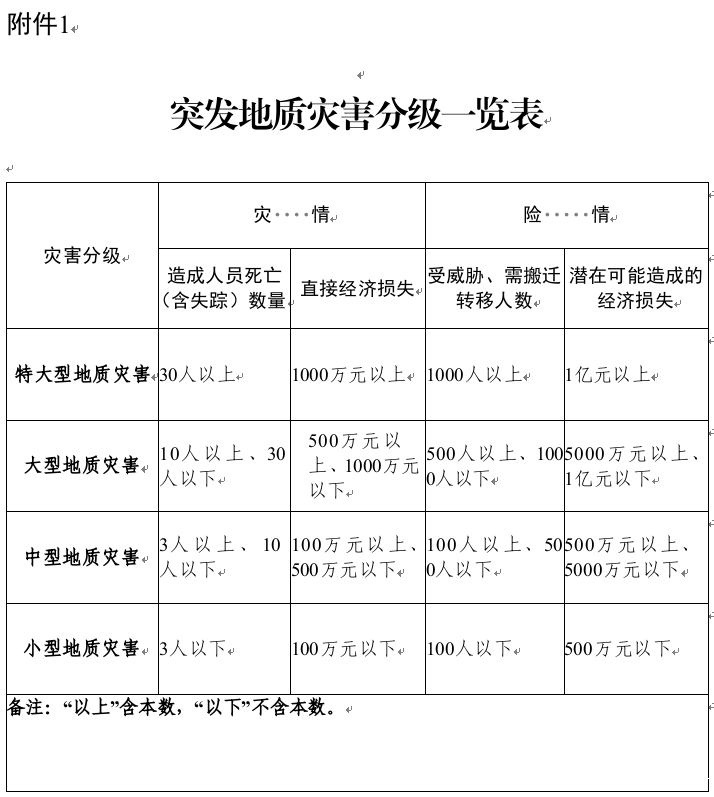 因灾死亡30人以上,或因灾造成直接经济损失1000万元以上的地质灾害灾情为特大型地质灾害灾情。