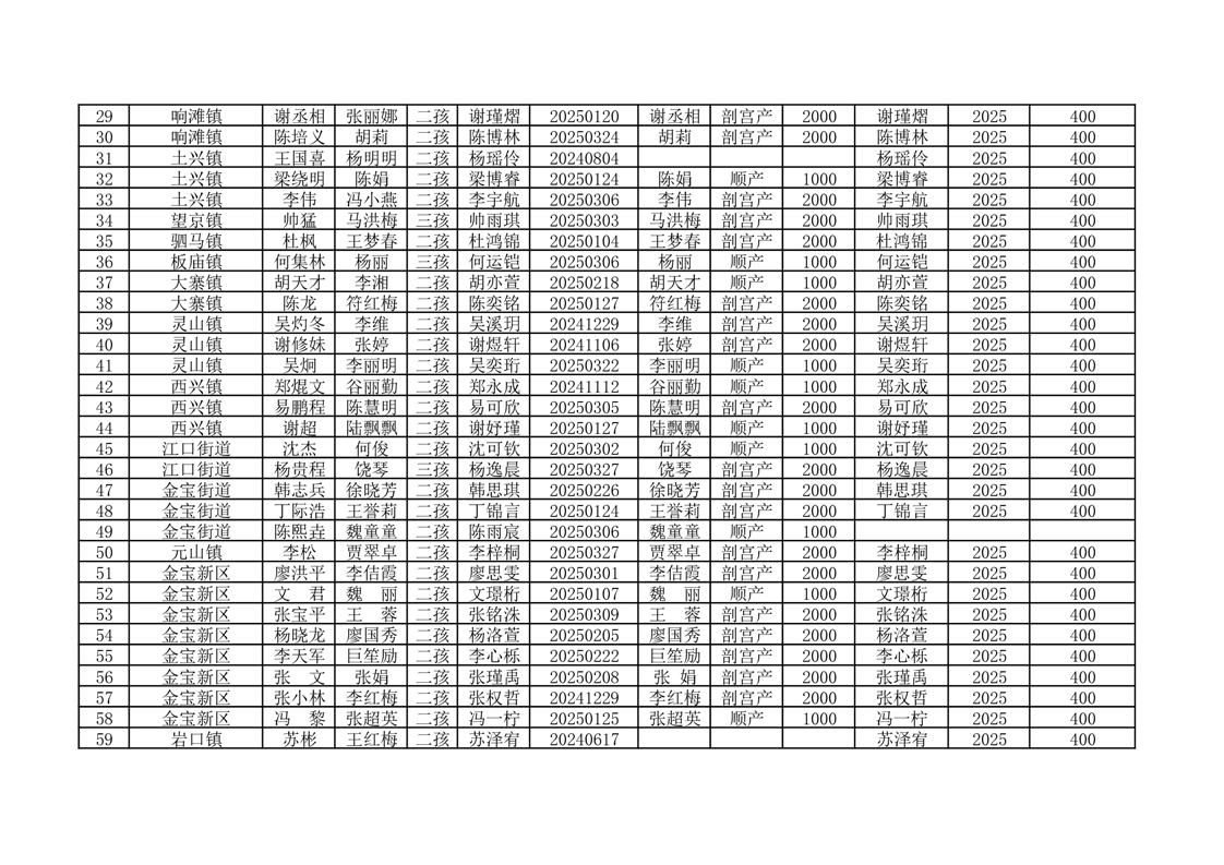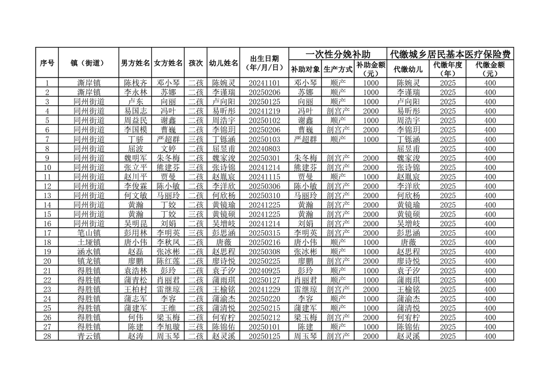 开云体育足球官网按政策生育二孩、三孩一次性分娩补助及城乡居民基本医疗保险费代缴花名册