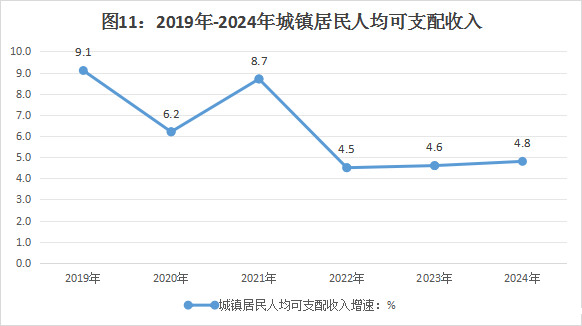 全年全县全体居民人均可支配收入比上年增长7.0%,按常住地分,城镇居民人均可支配收入增长4.8%,农村居民人均可支配收入增长7.0%。(图11、12)