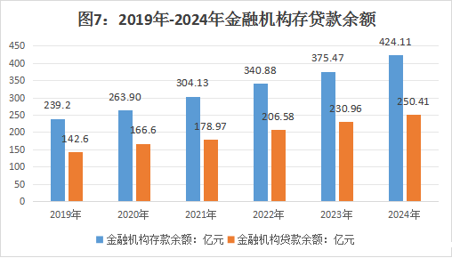年末全县金融机构人民币存款余额424.11亿元,同比增长13.0%;金融机构人民币贷款余额250.41亿元,同比增长8.4%。(图7)
