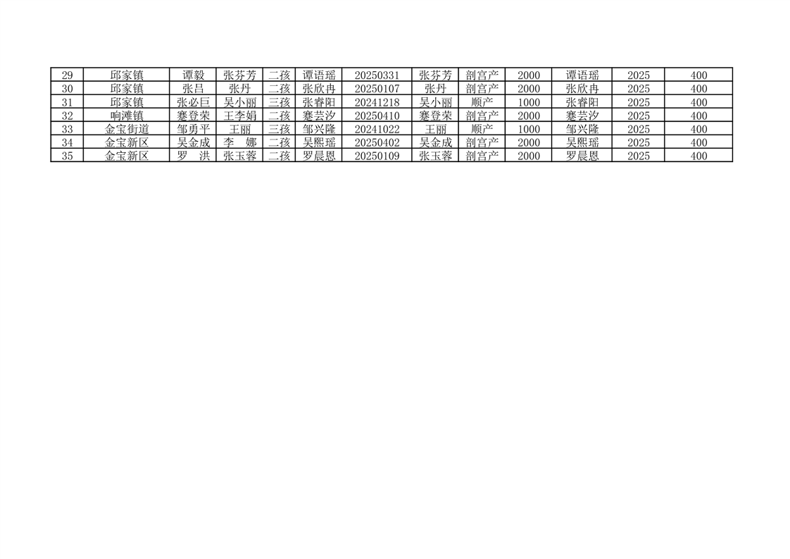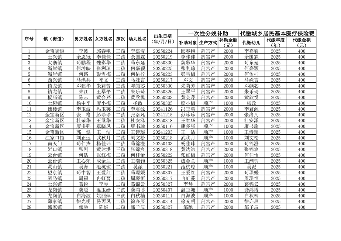 开云体育足球官网按政策生育二孩、三孩一次性分娩补助及城乡居民基本医疗保险费代缴花名册