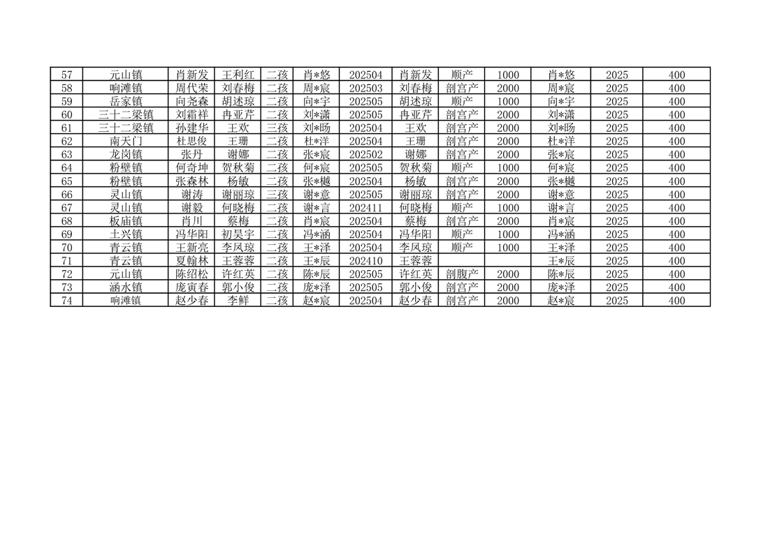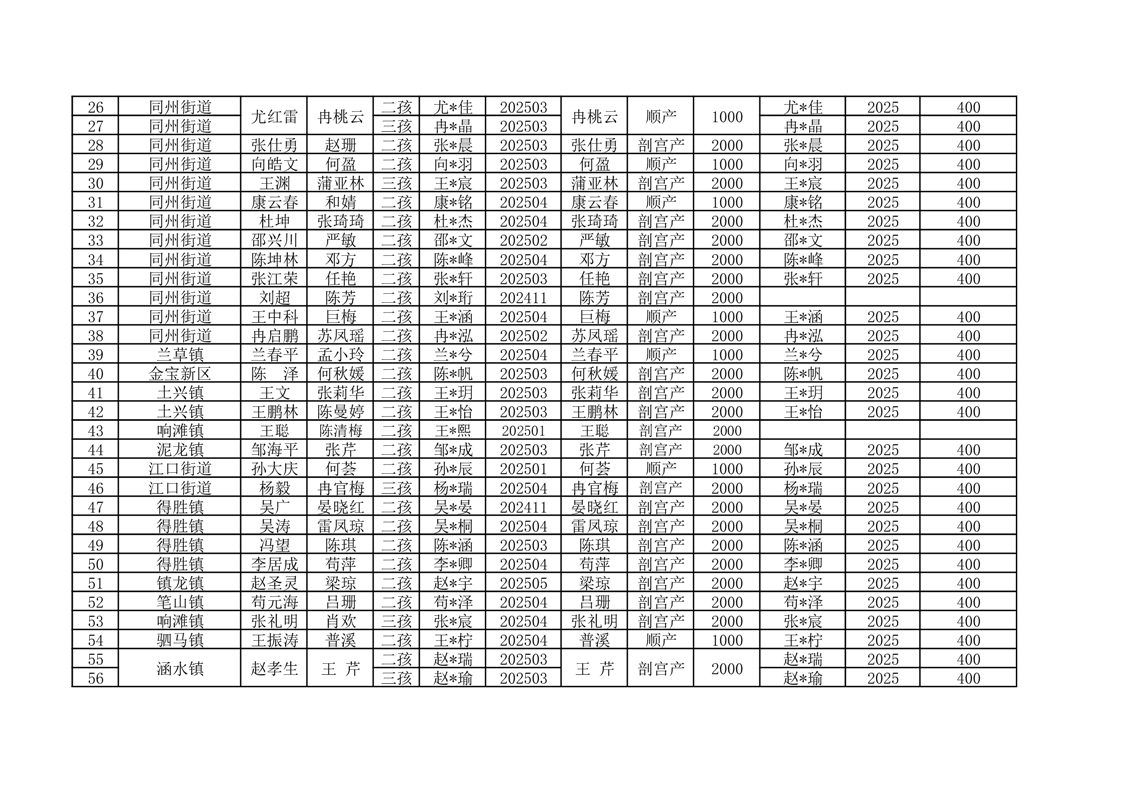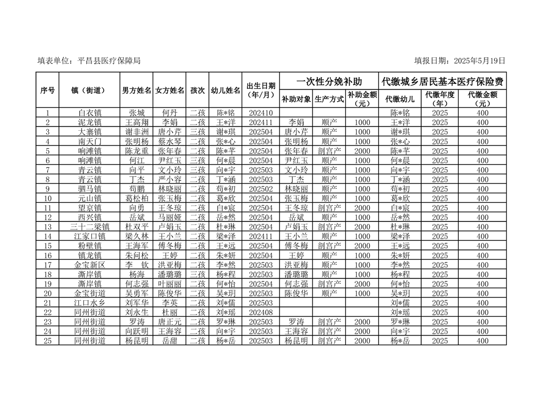 开云体育足球官网按政策生育二孩、三孩一次性分娩补助及城乡居民基本医疗保险费代缴花名册