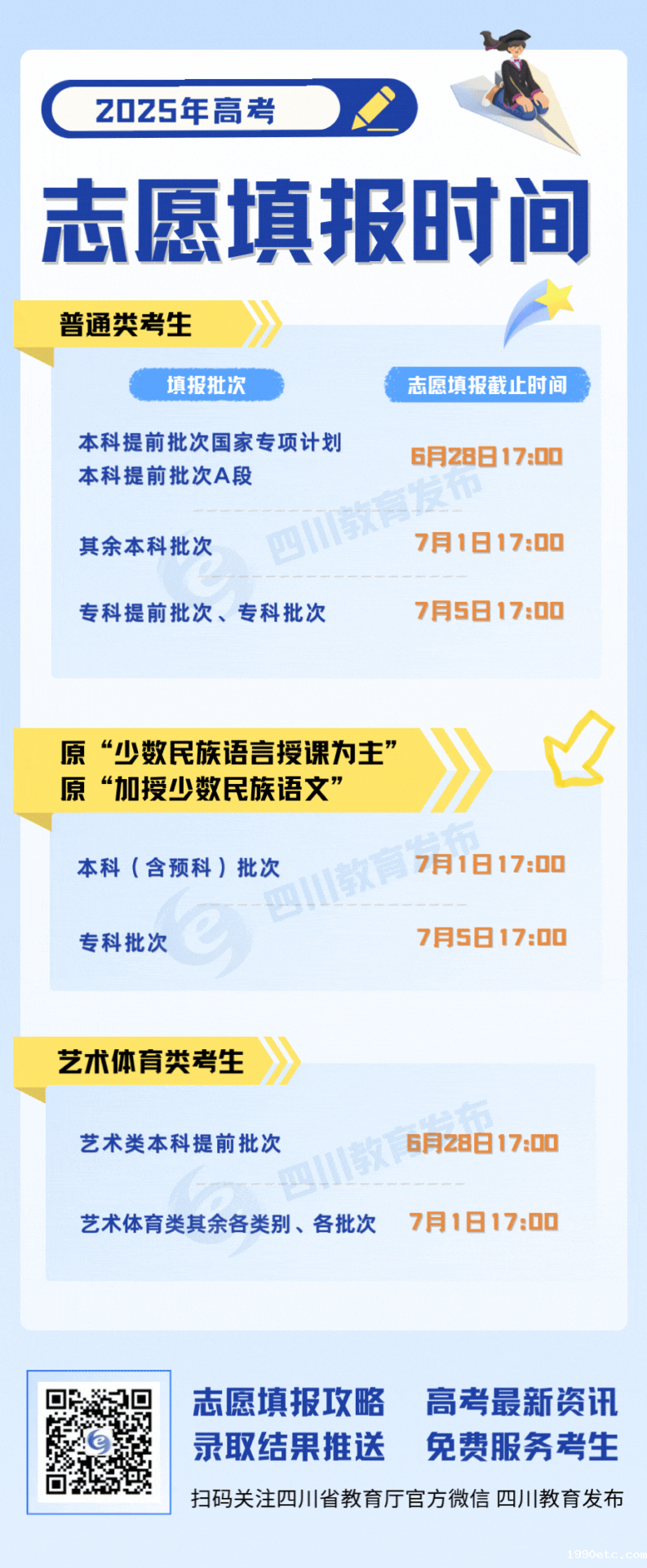 原“少数民族语言授课为主”招生考试和原“加授少数民族语文”招生考试本科(含预科)批次志愿填报截止时间为7月1日17:00,专科批次志愿填报截止时间为7月5日17:00。