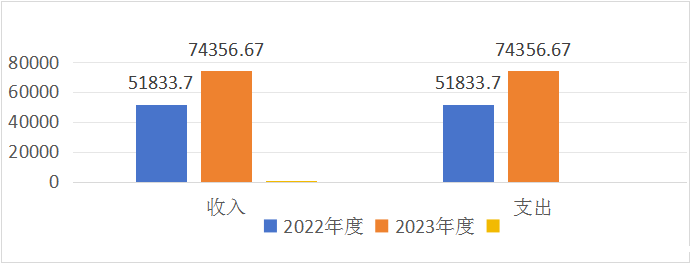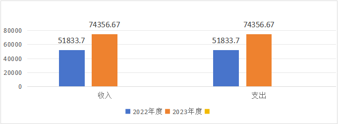 2023年度收、支总计均为74356.67万元。与2022年度相比,收、支总计各增加22522.97万元,增长43.45%。主要变动原因是上级项目补助资金增加。
