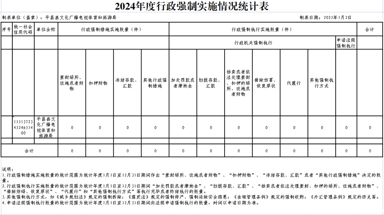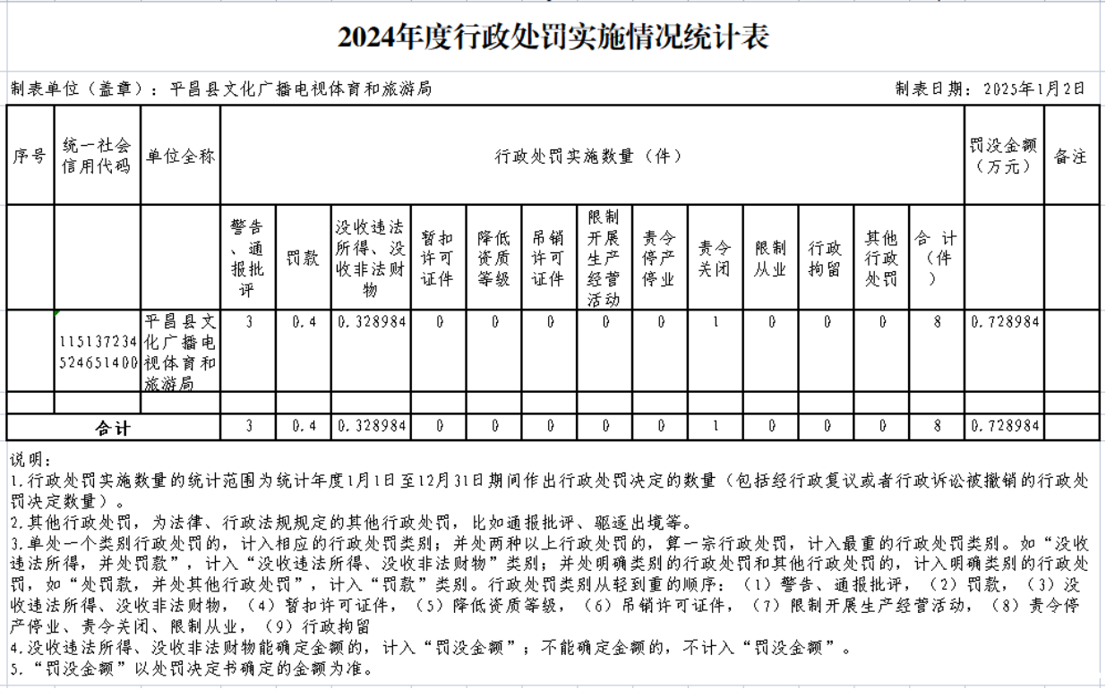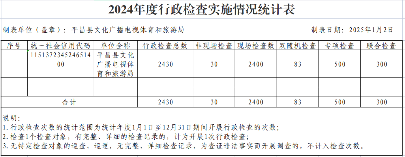 现将开云体育足球官网文化广播电视体育和旅游局2024年度行政许可、行政处罚、行政强制、行政检查实施情况公示如下:
