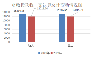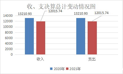 2021年度收、支总计各12015.74万元。与2020年相比,收、支总计各减少1195.19万元,下降9.05%。主要变动原因是优抚对像死亡及各项支出的压缩。