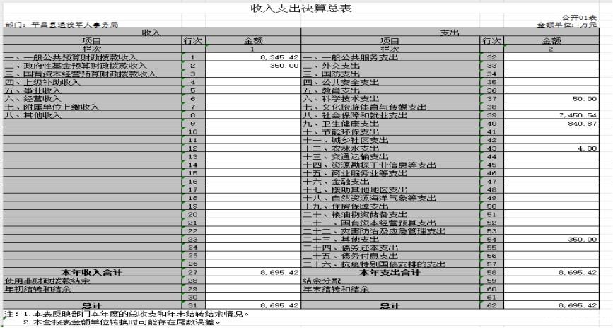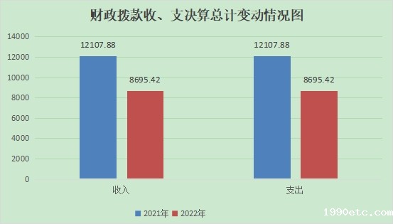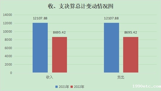 2022年度收、支总计8,695.42万元。与2021年相比,收、支总计各增加/减少-3,412.46万元,增长/下降-28.2%。主要变动原因是优抚对象死亡及落实中央政策,厉行节约,过紧日子各项支出的压缩。