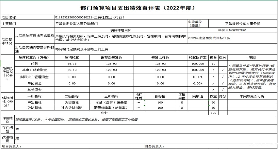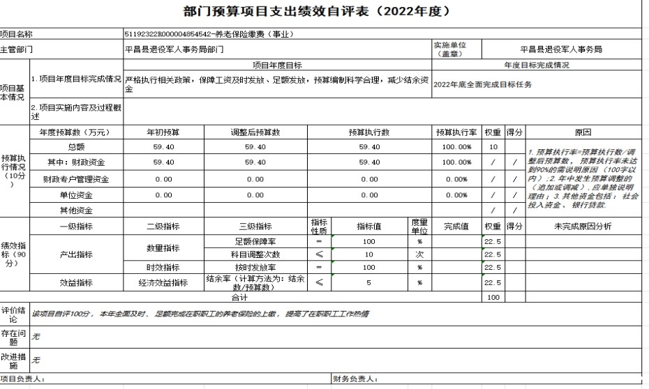 2022年全面完成退役军人事务局部门88人的基本工资、养老、医疗等基本运转支出的实现,提高在职职工的上班热情,障保的整个退役军人局部门的健康良性发展。
