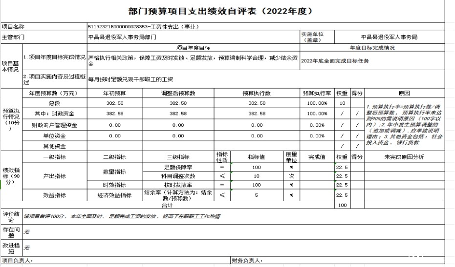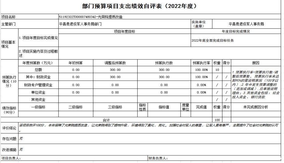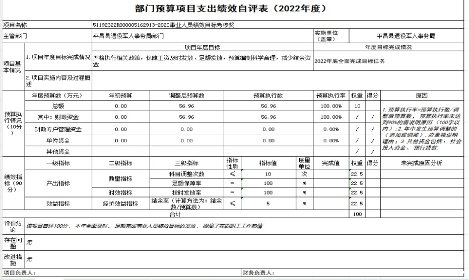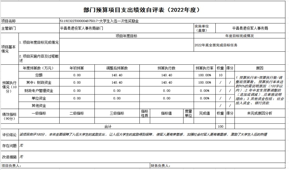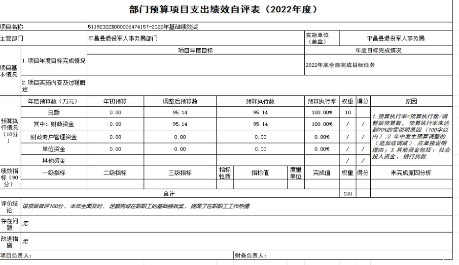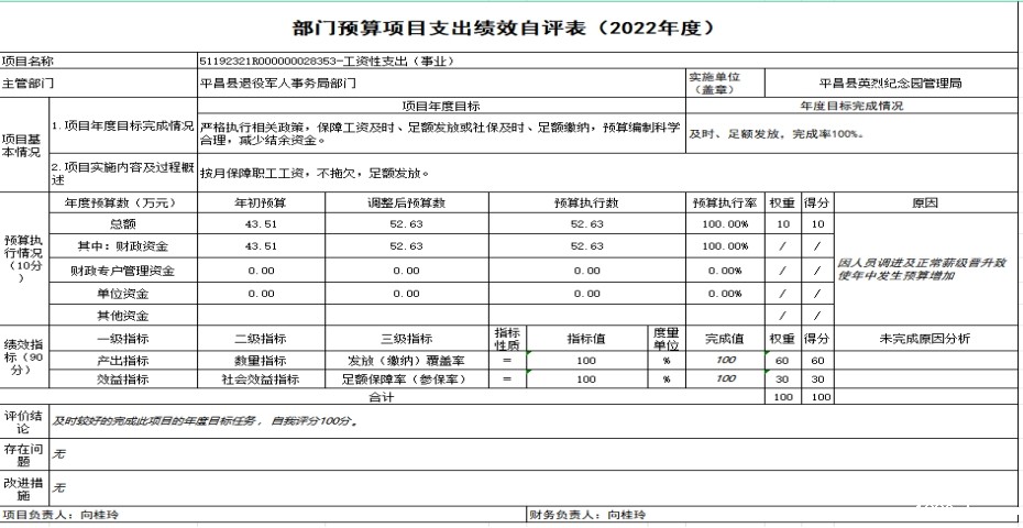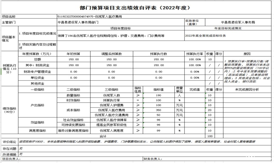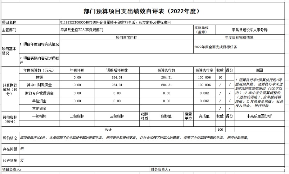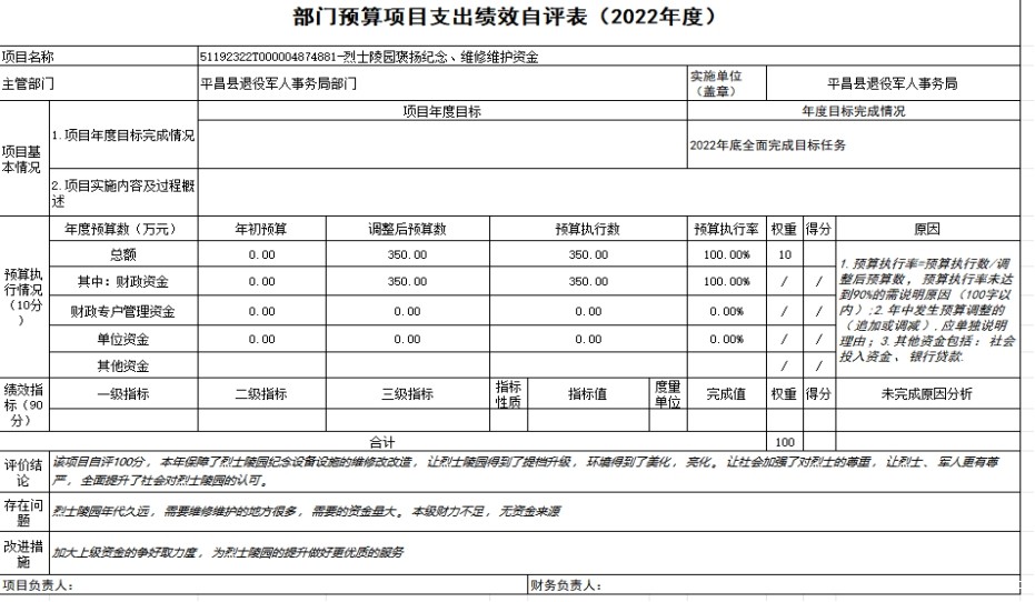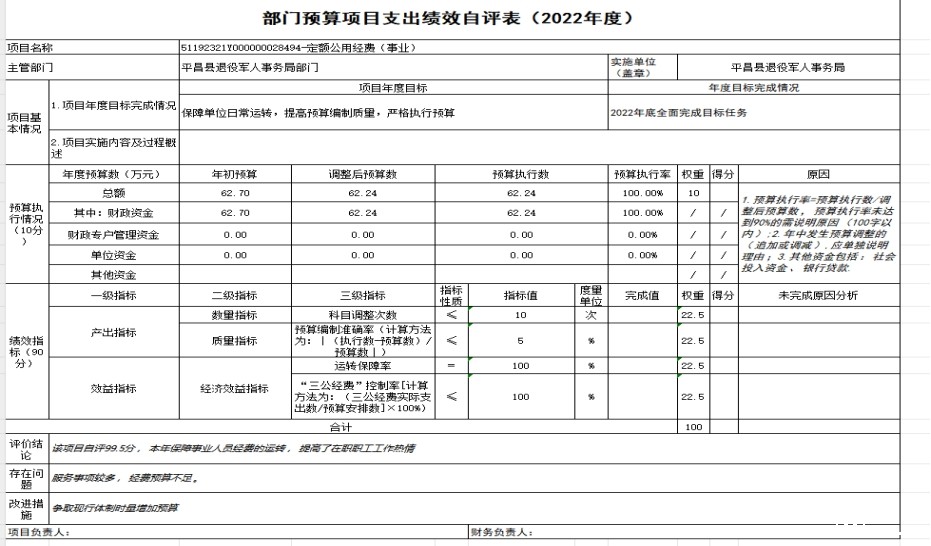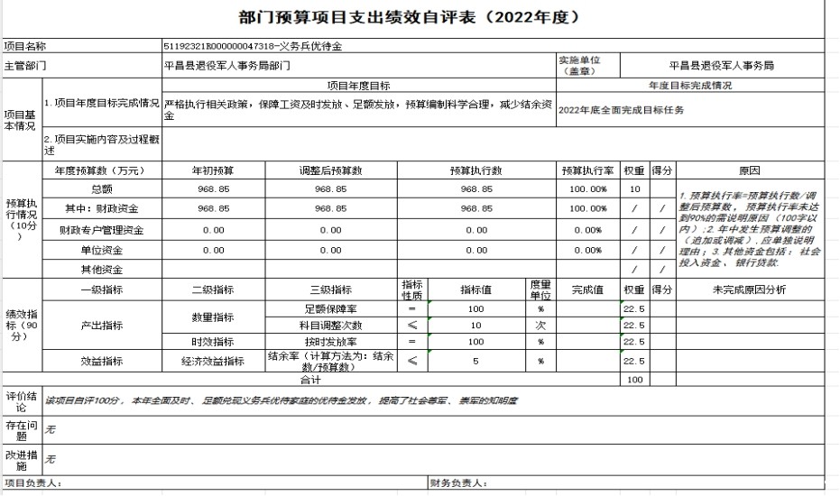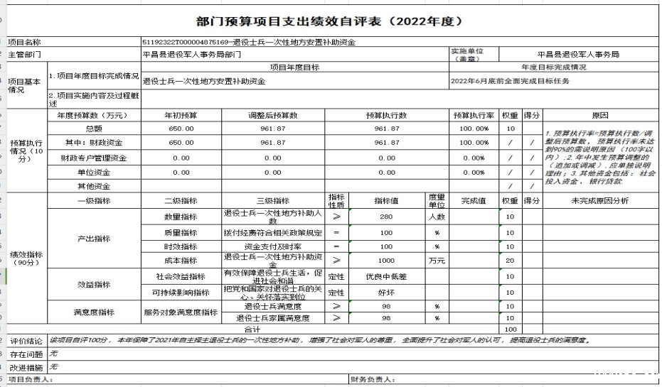 2022年度部门整体支出绩效目标设置完整,操作可行,其过程监控规范且长期有效。开云体育足球官网退役军人事务局合理安排、科学调度资金,全面实现各项资金支付有条不紊,各项预期经济效益、社会效益明显。