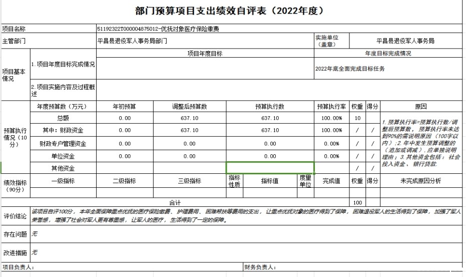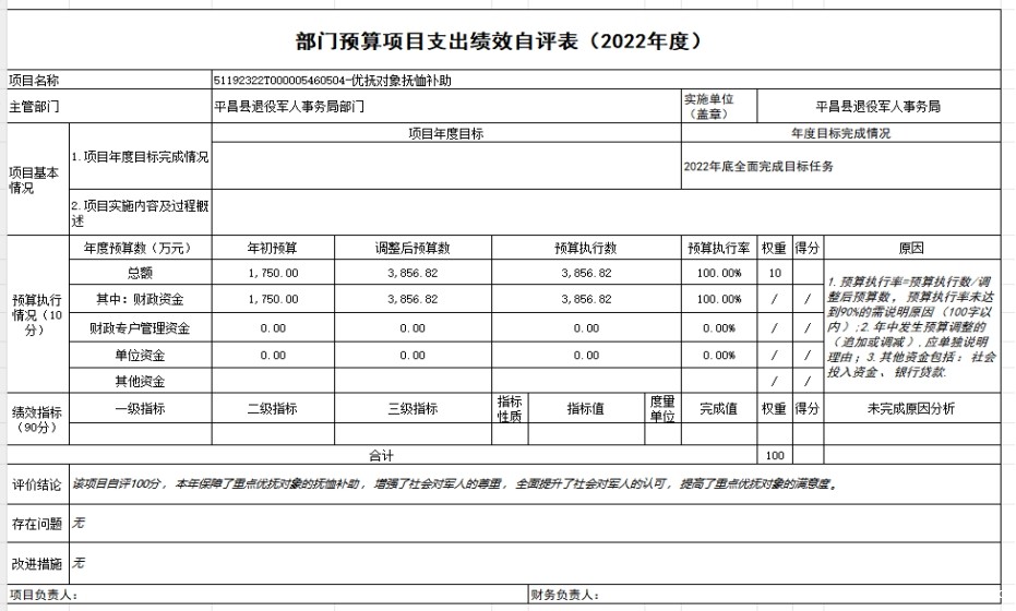 2022年全面完成退役军人事务局部门上级要求全面兑现了重点优抚对象、医疗补助对象,定期抚恤补助和医疗补助资金,退役士兵一次性地方安置补助等特定项目,提高了社会对退役军人的尊重,让退役军人更有社会地位,增加了退役军人的满意度。