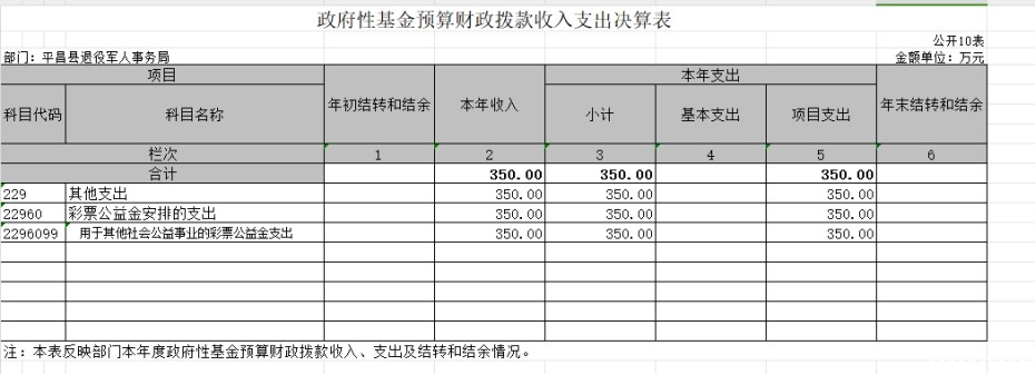 23、其他支出(类)彩票公益金安排的支出(款)用于其他社会公益事业的彩票公益金支出(项):支出决算为350万元,完成预算100%。