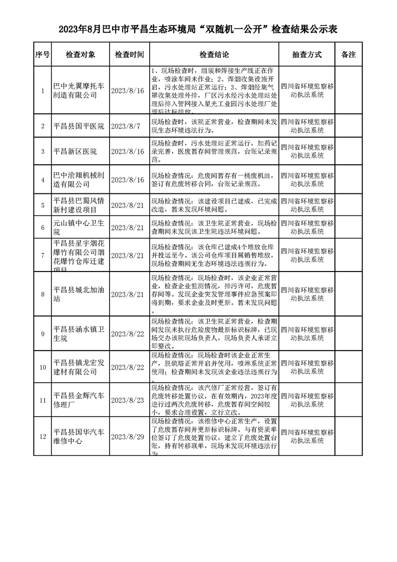 2023年8月巴中市平昌生态环境局“双随机、一公开”检查结果公示表