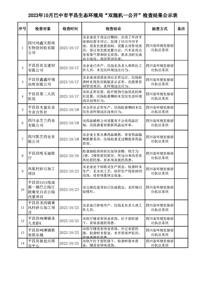 2023年10月巴中市平昌生态环境局“双随机、一公开”检查结果公示表