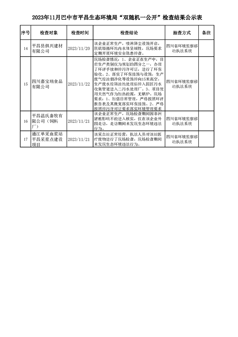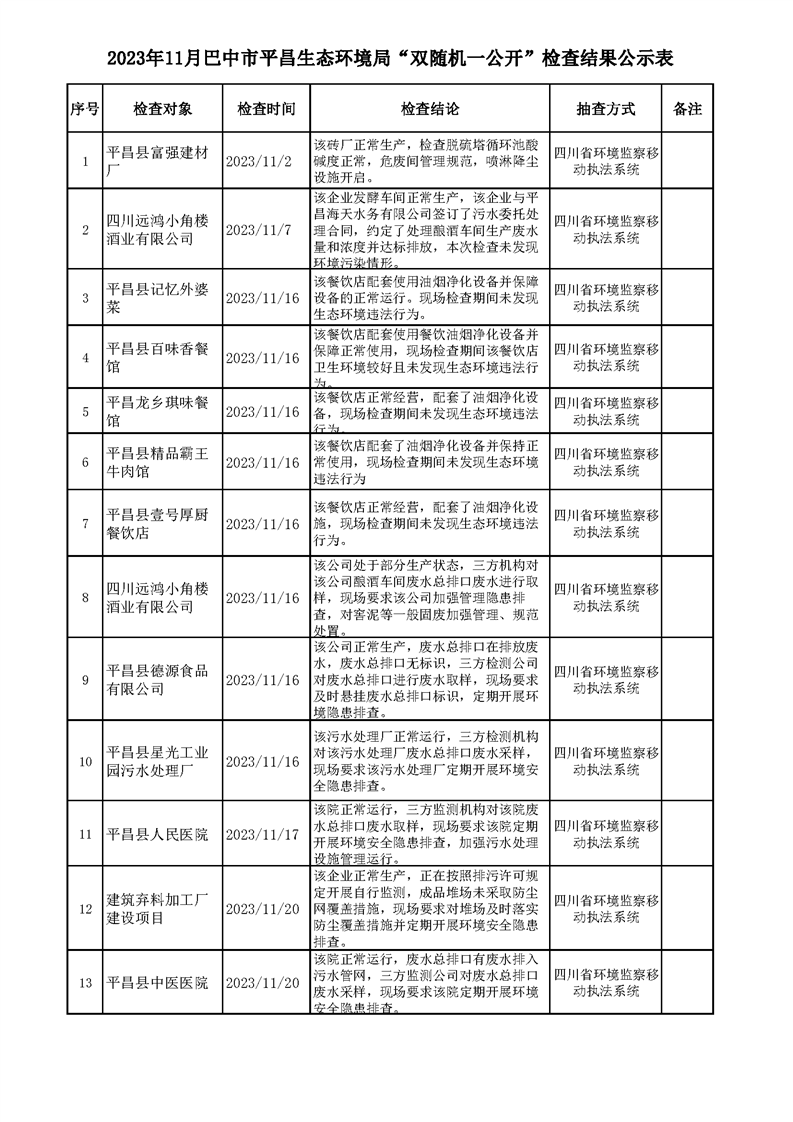 2023年11月巴中市平昌生态环境局“双随机、一公开”检查结果公示表