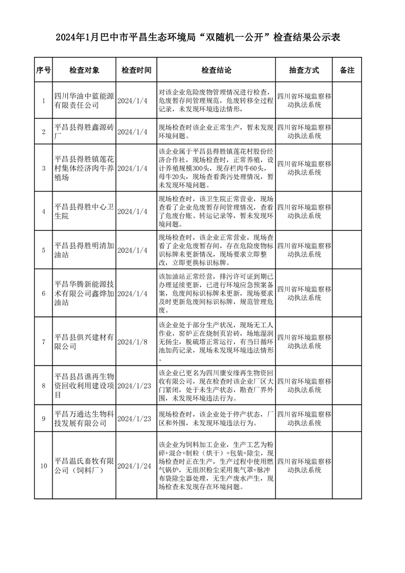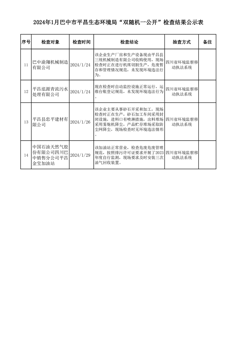 2024年1月巴中市平昌生态环境局“双随机、一公开”检查结果公示表