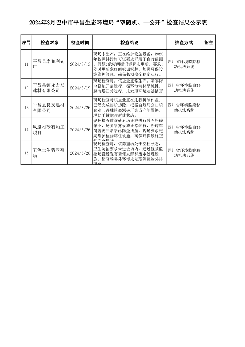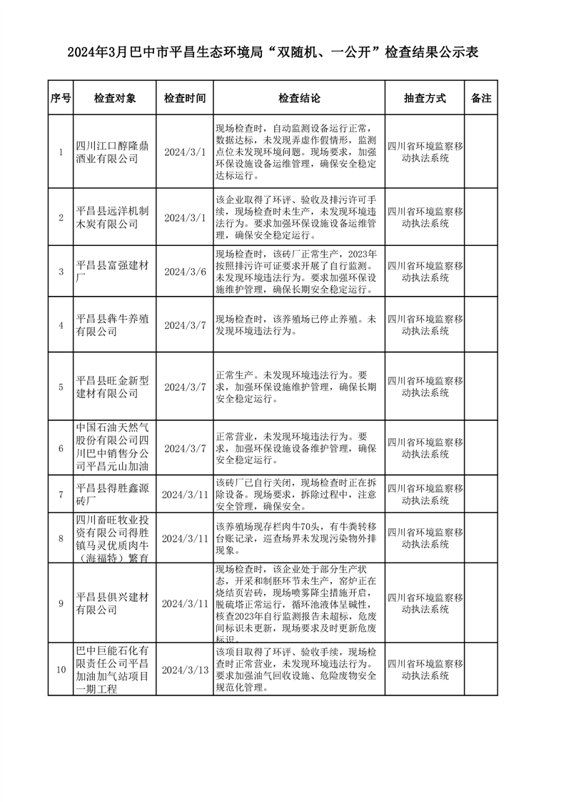 2024年3月巴中市平昌生态环境局“双随机、一公开”检查结果公示表