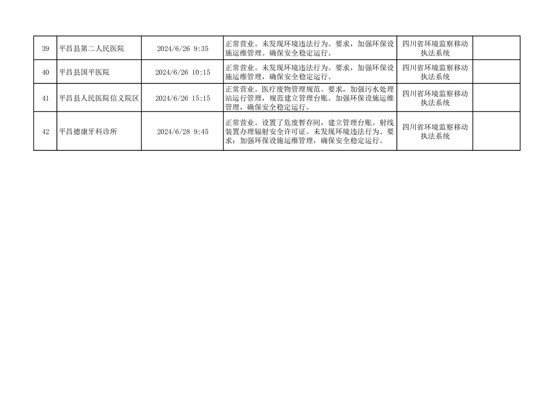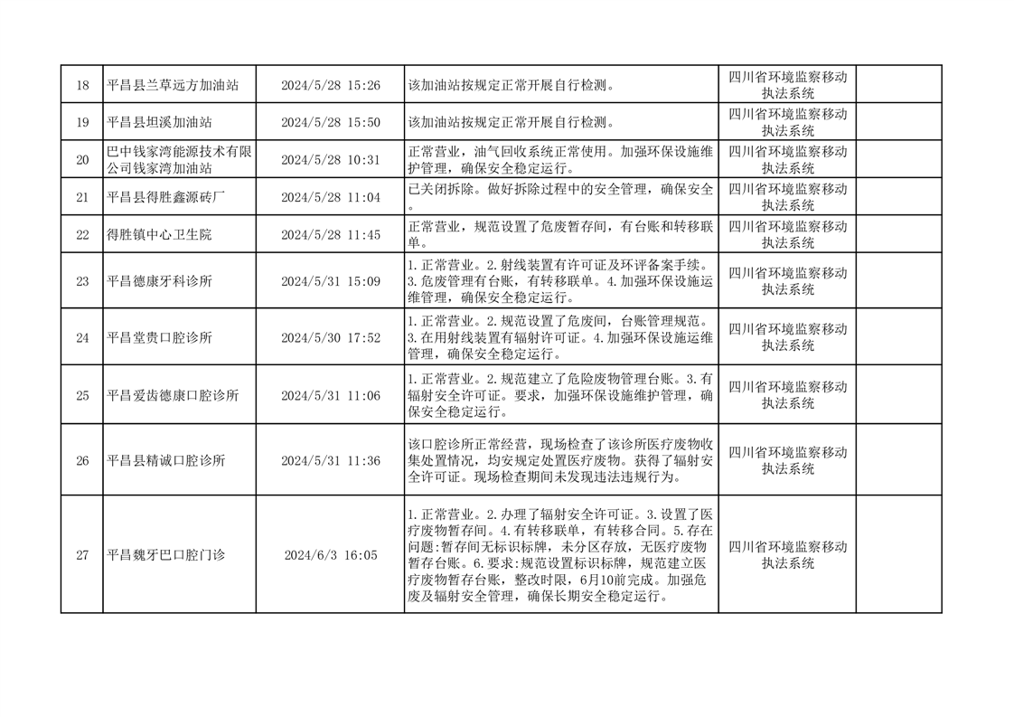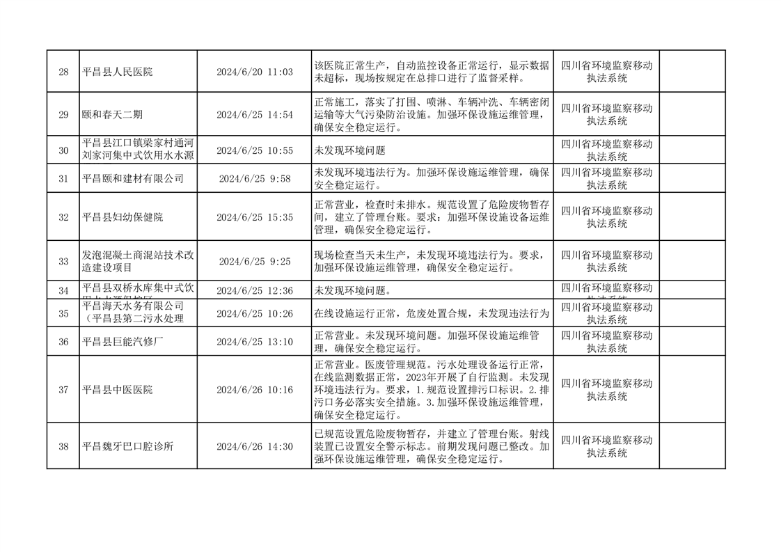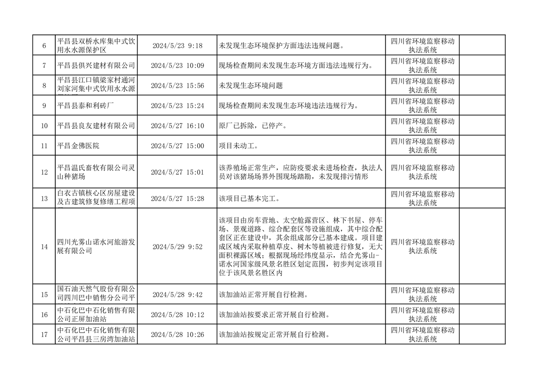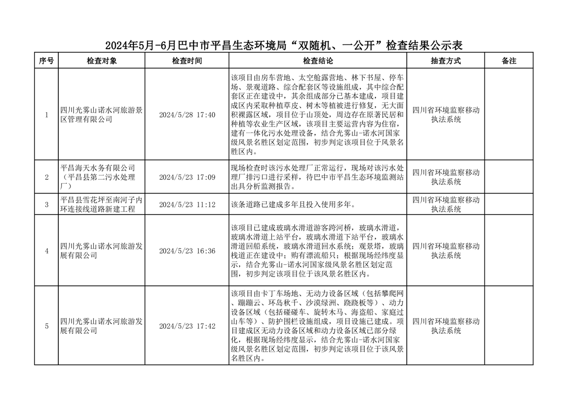 2024年5月-6月巴中市平昌生态环境局“双随机、一公开”检查结果公示表
