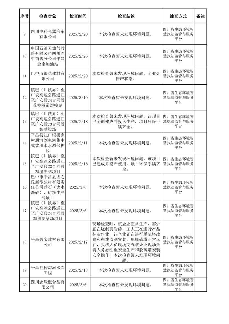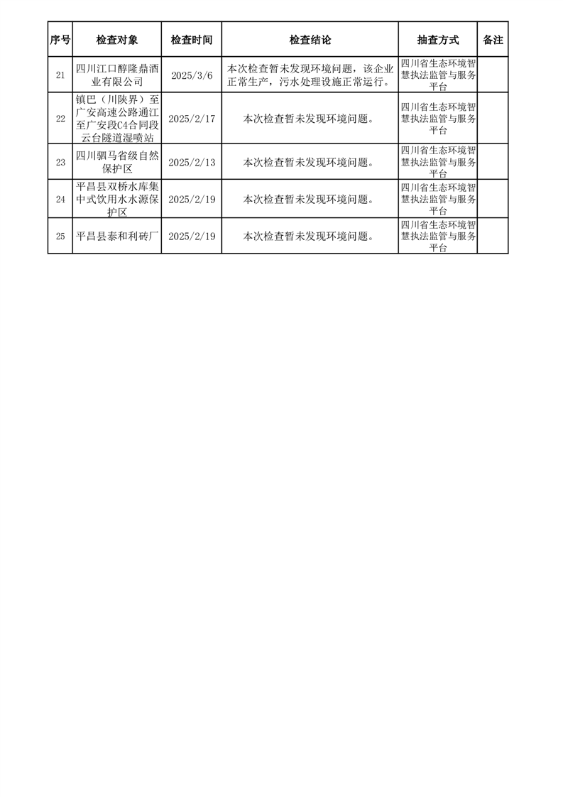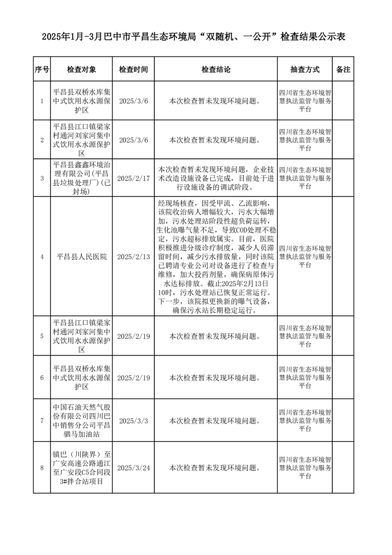 2025年1月-3月巴中市平昌生态环境局“双随机、一公开”检查结果公示表