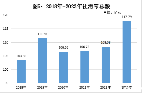全年实现社会消费品零售总额117.79亿元,比上年增长8.7%,其中限额以上企业(单位)实现消费品零售额27.86亿元,同比下降0.7%。(图5)