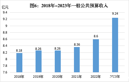 全年地方一般公共预算收入9.24亿元,同比增长7.5%,其中税收收入3.25亿元,同比增长12.5%。一般公共预算支出59.34亿元,同比增长5.2%。(图6)
