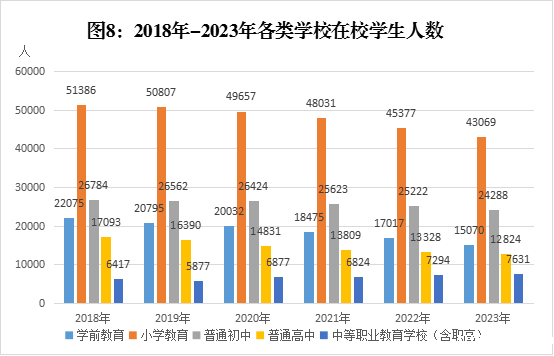 年末共有各级各类学校118所。其中,幼儿园29所,完全小学26所,九义校40所,高完中5所,职业高中1所,中等职业学校1所,特殊教育学校1所。在校学生8.79万人,专任教师8214人。职业中学全年招生2714人,在校生7631人,毕业生2020人。普通高中全年招生4387人,在校生12824人,毕业生4557人,升学率92%。普通初中全年招生7792人,在校生24288人,毕业生8605人,升学率99.85%。普通小学全年招生6335人,在校生43069人,毕业生7932人。特殊教育学校全年招生16人,在校生41人,毕业生0人。在园幼儿15070人,学龄儿童入学率100%。(图8)