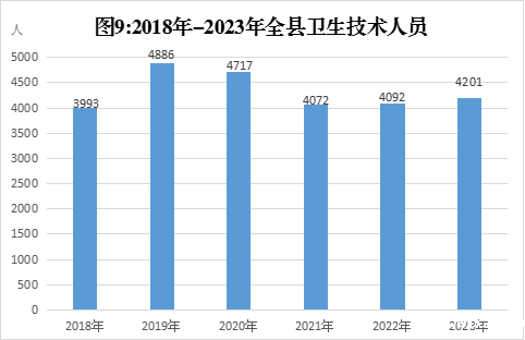 年末共有医疗卫生机构757个,其中县级医院4个、妇幼保健院1个、乡镇卫生院38个、疾病预防控制中心1个、社区卫生服务中心(站)6个、诊所(卫生所、医务室)169个、村级卫生室520个。年末共有卫生技术人员4201人,其中执业医师和助理医师1553人、注册护士1762人、药师159人、技师(士)301人。年末医疗卫生机构共有床位5357张,其中医院3132张、乡镇卫生院1836张、妇幼保健院120张。全年医疗机构总诊疗人465.45万人次,比上年增长5.5%。其中,住院入院18.22万人次,增长21.5%;出院18.26万人次,增长22.1%。产妇住院分娩率100%,孕产妇死亡率为0/10万。全年共接种儿童疫苗6.8万人次,儿童疫苗接种率达99.85%。(图9)