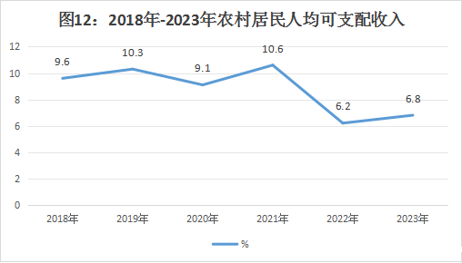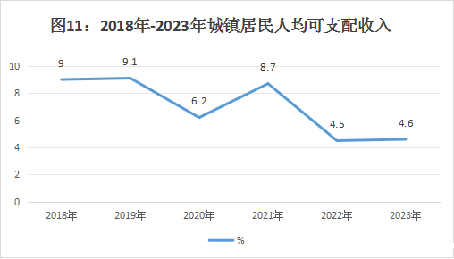 全年全体居民人均可支配收入比上年增长6%,按常住地分,城镇居民人均可支配收入增长4.6%,农村居民人均可支配收入增长6.8%。(图11、12)