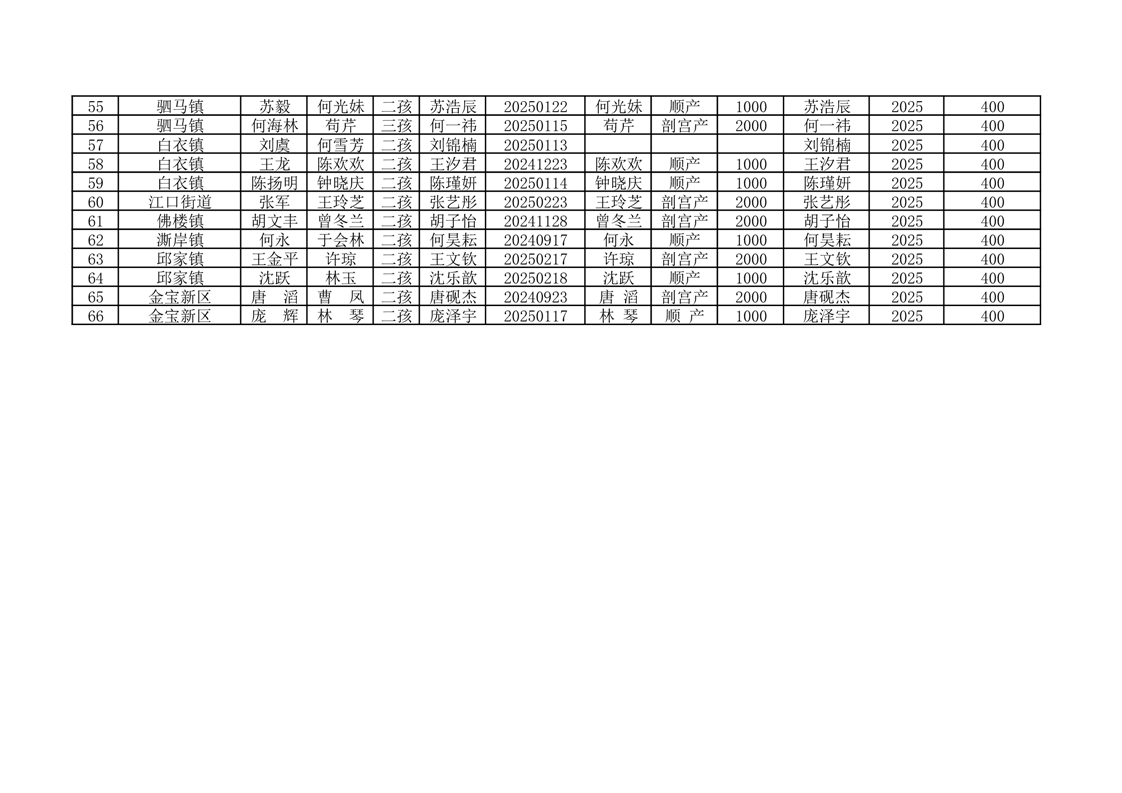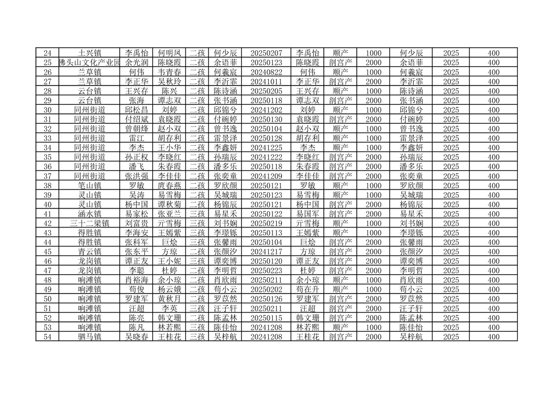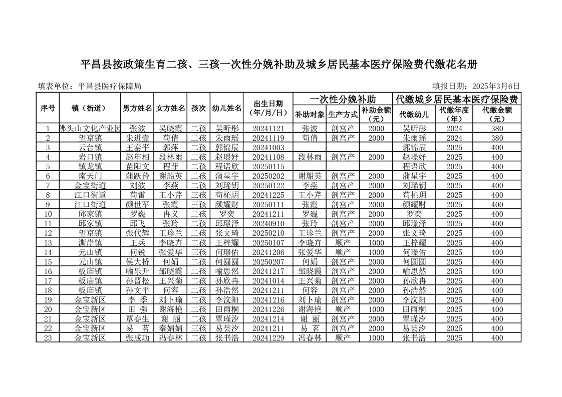 开云体育足球官网按政策生育二孩、三孩一次性分娩补助及城乡居民基本医疗保险费代缴花名册