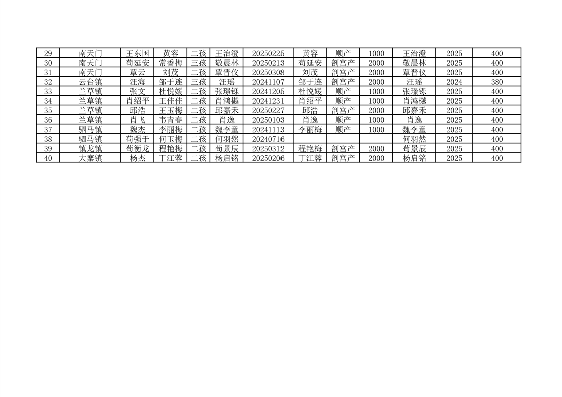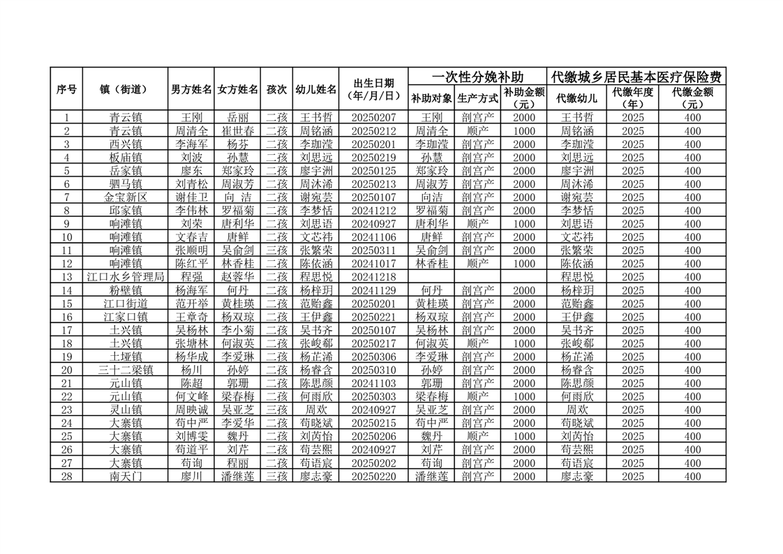开云体育足球官网按政策生育二孩、三孩一次性分娩补助及城乡居民基本医疗保险费代缴花名册