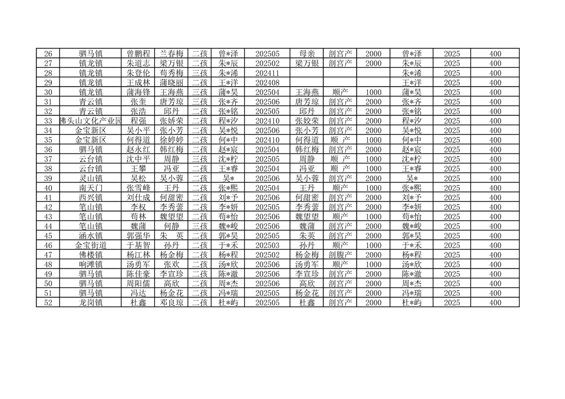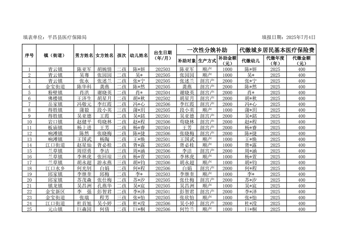 开云体育足球官网2025年度按政策生育二孩、三孩一次性分娩补助及城乡居民基本医疗保险费代缴花名册
