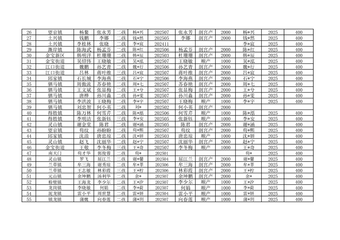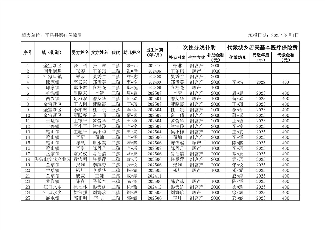 开云体育足球官网2025年度按政策生育二孩、三孩一次性分娩补助及城乡居民基本医疗保险费代缴花名册