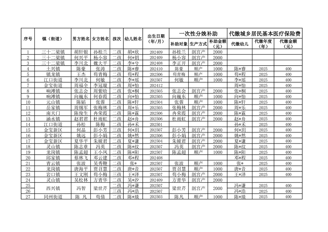开云体育足球官网2025年度按政策生育二孩、三孩一次性分娩补助及城乡居民基本医疗保险费代缴花名册