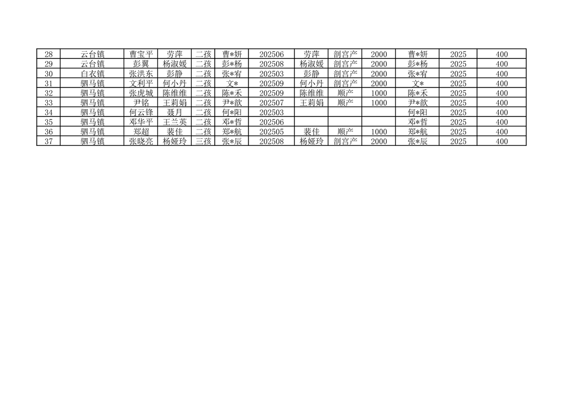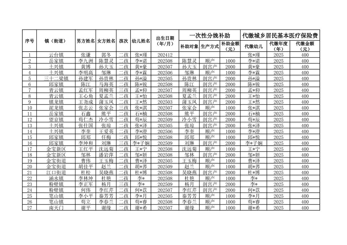 开云体育足球官网2025年度按政策生育二孩、三孩一次性分娩补助及城乡居民基本医疗保险费代缴花名册
