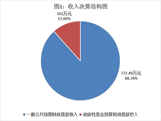 2021年本年收入合计874.49万元,其中:一般公共预算财政拨款收入772.49万元,占88.34%;政府性基金预算财政拨款收入102万元,占11.66%。