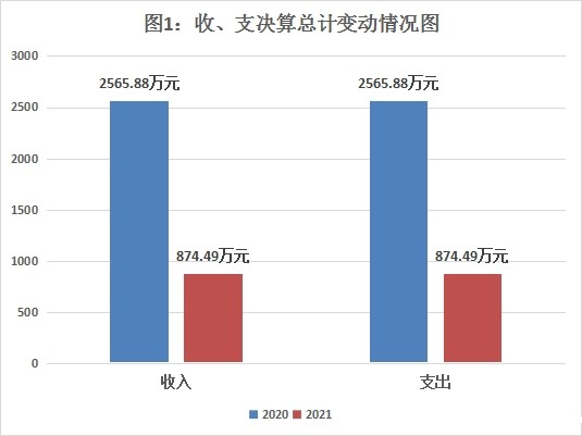 2020年度收、支总计各874.49万元。与2020年相比,收、支总计各减少1691.39万元,减少65.92 %。主要变动原因是项目和政府性基金减少。