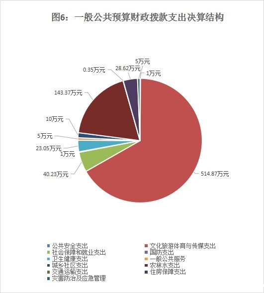2021年一般公共预算财政拨款支出772.49万元,主要用于以下方面:一般公共服务支出(类)5万元,占0.65%;国防支出(类)1万元,占0.13%;公共安全支出(类)1万元,占0.13%;文化旅游体育与传媒支出(类)514.87万元,占66.65%;社会保障和就业支出(类)40.23万元,占5.21%;卫生健康支出(类)23.05万元,占2.98%;城乡社区支出(类)10万元,占1.29%;农林水支出(类)143.37万元,占18.56%;交通运输支出(类)0.35万元,占0.05%;住房保障支出(类)28.62万元,占3.7%;灾害防治及应急管理支出支出(类)5万元,占0.65%。