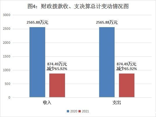 2021年财政拨款收、支总计各874.49万元。与2020年相比,财政拨款收、支总计各减少1691.39万元,减少65.92%。主要变动原因是项目和政府性基金减少。