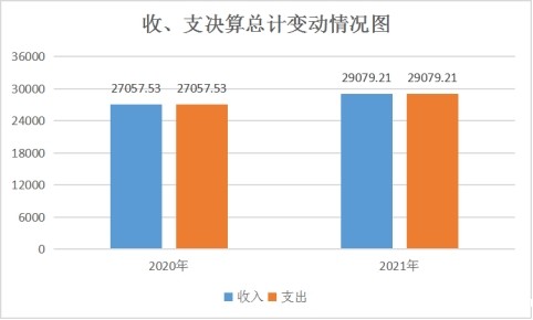 2021年度收、支总计各29079.21万元。与2020年相比,收、支总计各增加2021.69万元,增长7.47%。主要变动原因是部门正常开支浮动。