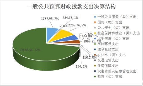 2021年一般公共预算财政拨款支出27125.36万元,主要用于以下方面:一般公共服务(类)支出1787.95万元,占7%;国防(类)支出2.00万元,占0%;公共安全(类)支出284.68万元,占1%;教育(类)支出19448.46万元,占72%;社会保障和就业(类)支出2269.76万元,占8%;卫生健康支出1444.88万元,占5%;节能环保(类)支出2.00万元,占0%;农林水(类)支出1067.81万元,占4%;交通运输(类)支出556.63万元,占2%;住房保障支出110.20万元,占0%;灾害防治及应急管理支出134.00万元,占1%。