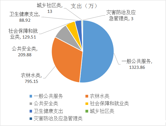 2022年一般公共预算财政拨款支出2663.32万元,主要用于以下方面:一般公共服务(类)支出1323.86万元,占49.7%;公共安全(类)支出309.88万元,占11.64%;社会保障和就业(类)支出129.51万元,占4.86%;卫生健康支出88.92万元,占3.33%;城乡社区(类)支出13万元,占0.48%;农林水(类)支出795.15万元,占29.86%;灾害防治及应急管理(类)支出3万元,0.13%。