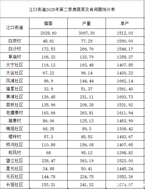江口街道2025年第二季度蔬菜及食用菌统计表