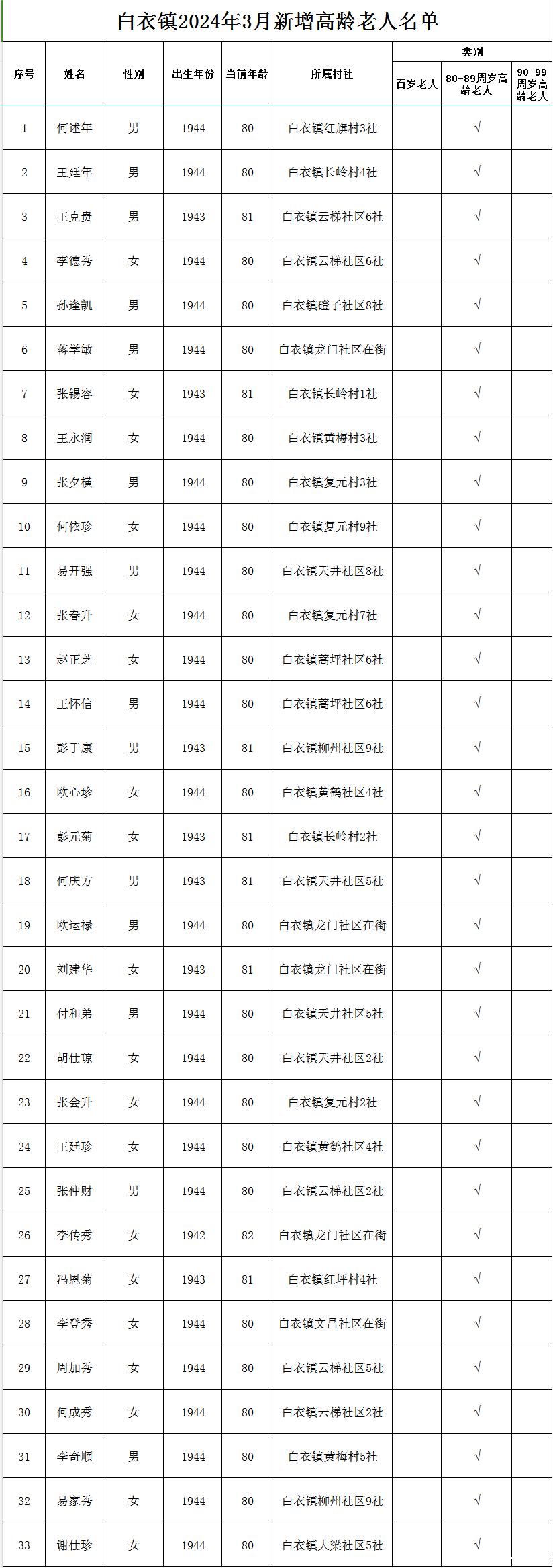 白衣镇2024年3月新增高龄老人名册