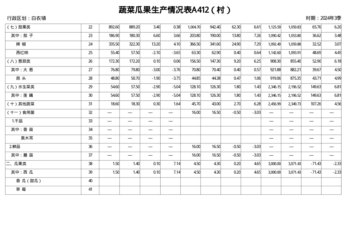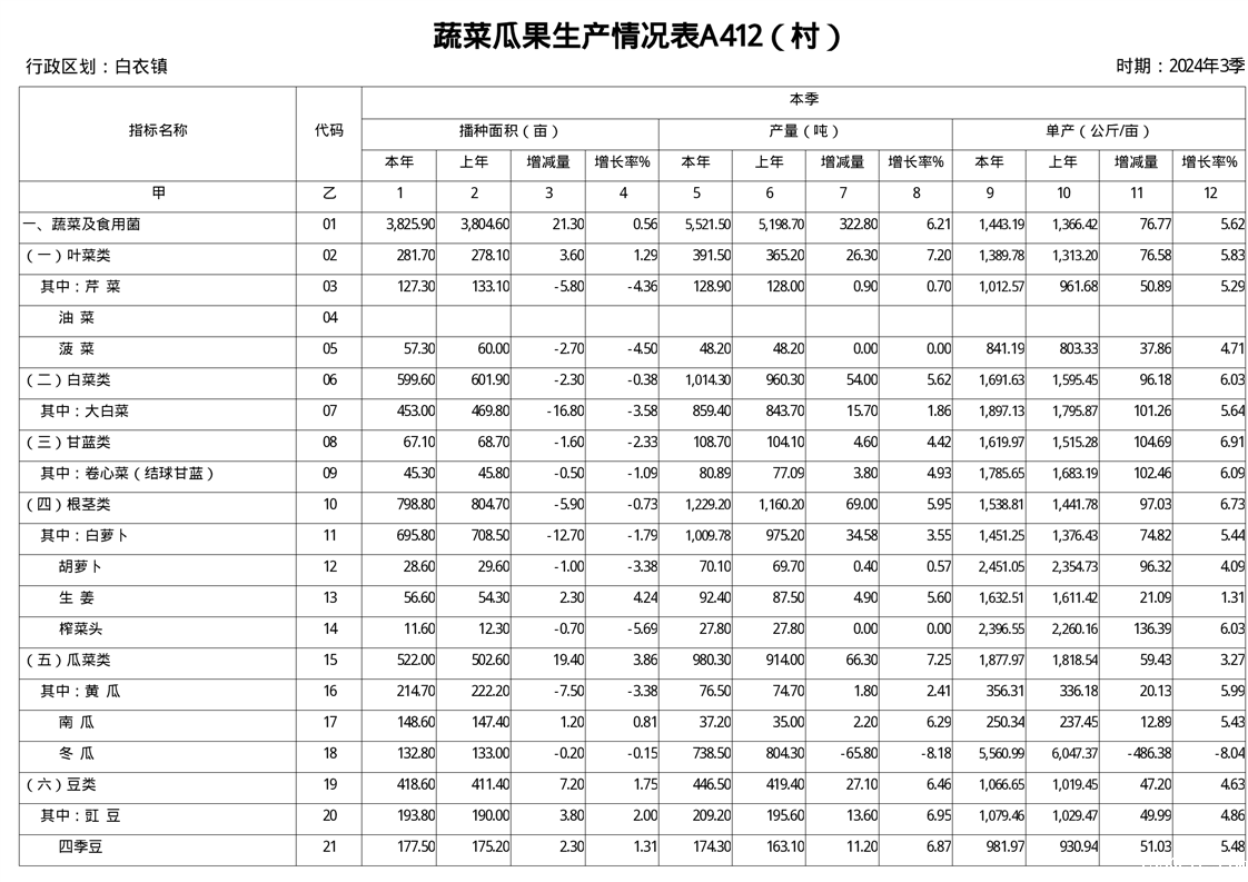 白衣镇2024年第三季度蔬菜瓜果生产统计数据