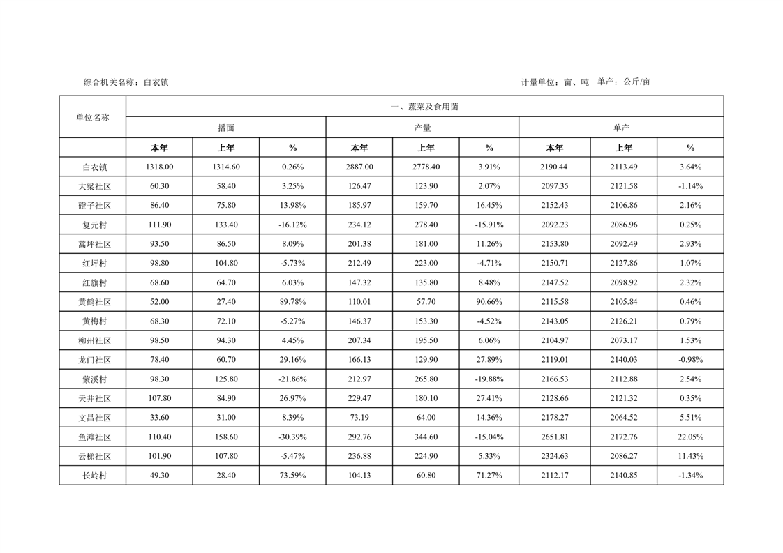白衣镇2025年一季度蔬菜及食用菌统计数据报表