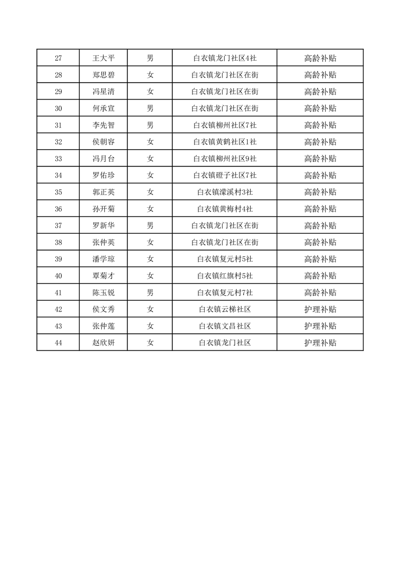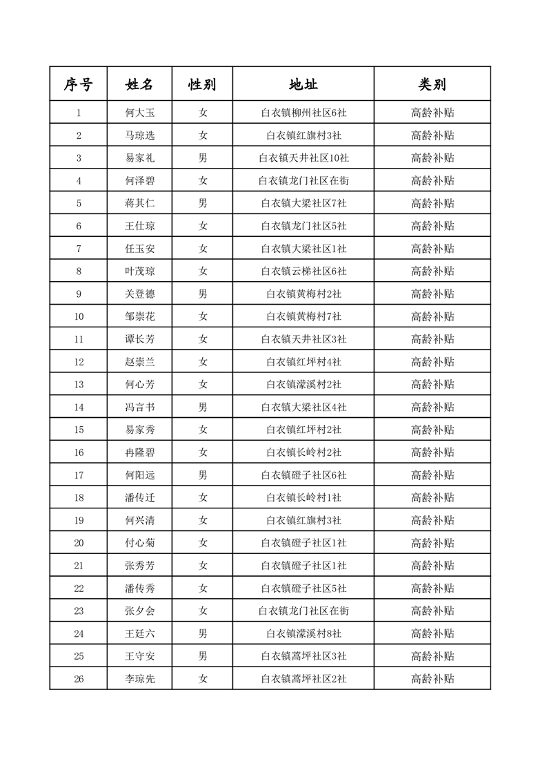 白衣镇2025年一季度高龄补贴及重度残疾人护理补贴申请花名册