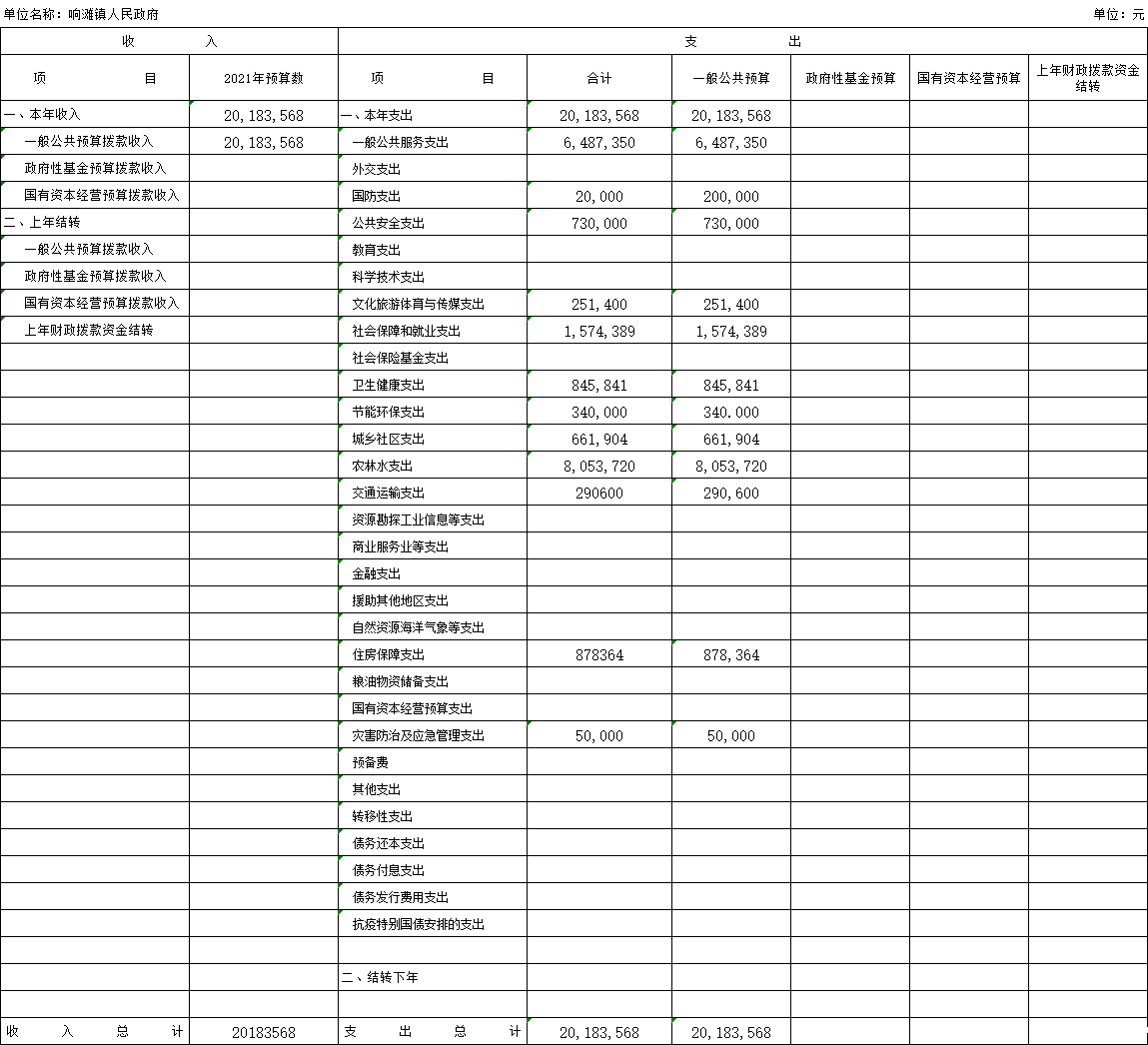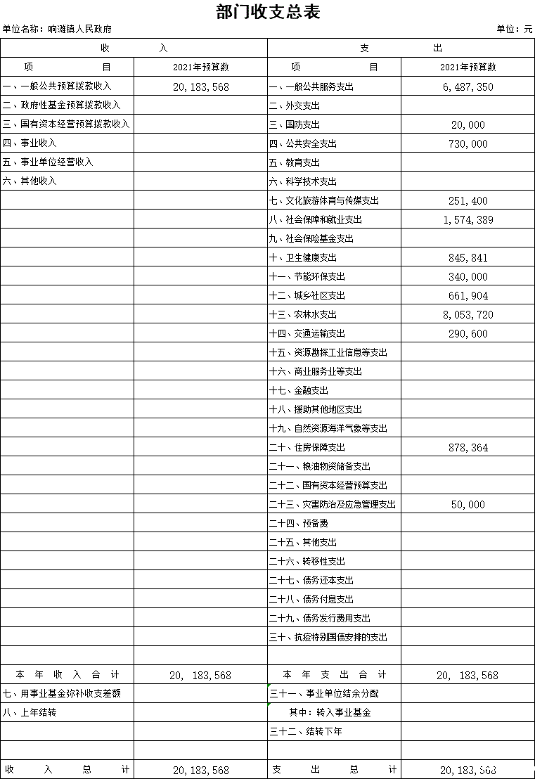 按照综合预算的原则,开云体育足球官网响滩镇所有收入和支出均纳入部门预算管理。收入包括:一般公共预算拨款收入;支出包括:一般公共服务支出,国防支出,公共安全支出,文化旅游体育与传媒支出,社会保障和就业支出,卫生健康支出,节能环保支出,城乡社区支出,农林水支出,交通运输支出,住房保障支出,灾害防治及应急管理支出。开云体育足球官网响滩镇2021年度收入预算总额为2018.36万元,支出预算总额为2018.36万元。与2020年相比,收支总额各增加837.02万元,增加70.85%,主要原因是:行政区划调整原南风乡、原黑水乡、原福申乡的永安村,万安村,玉峰村整体并入响滩后预算到本单位。