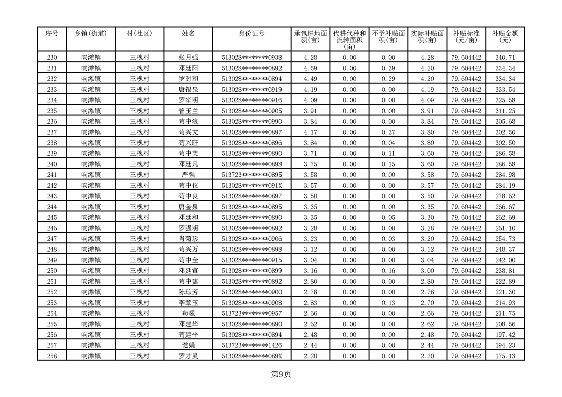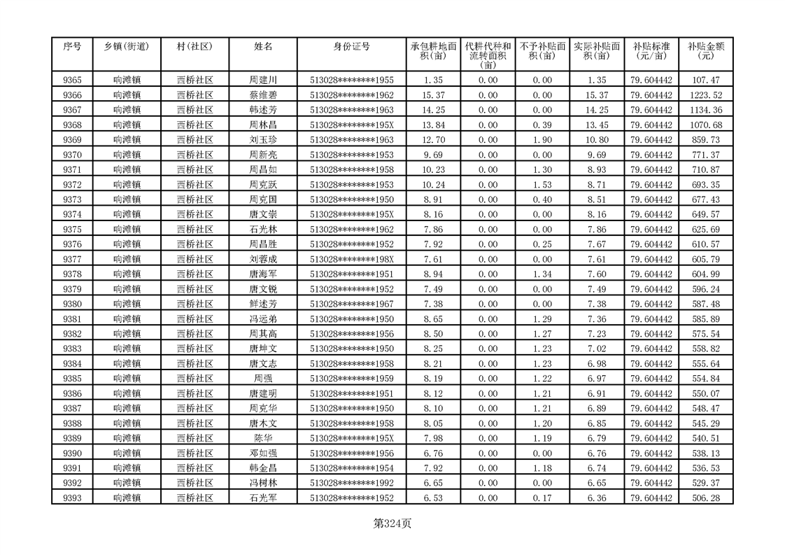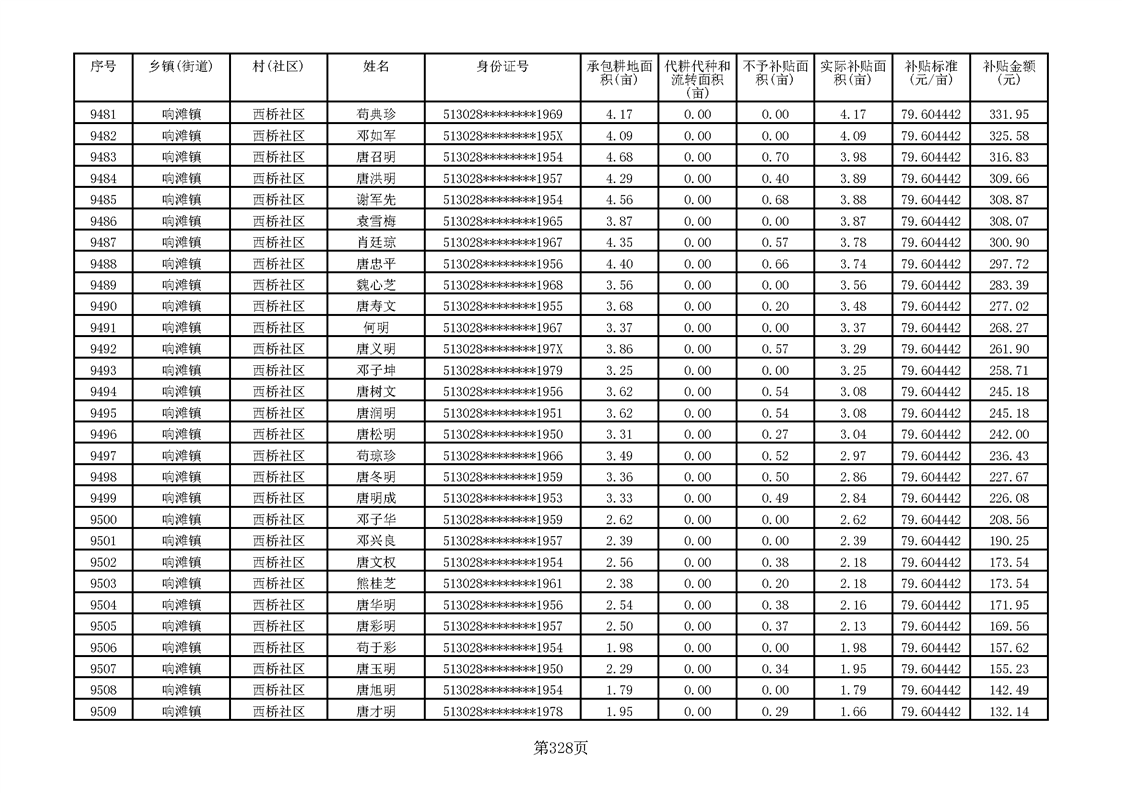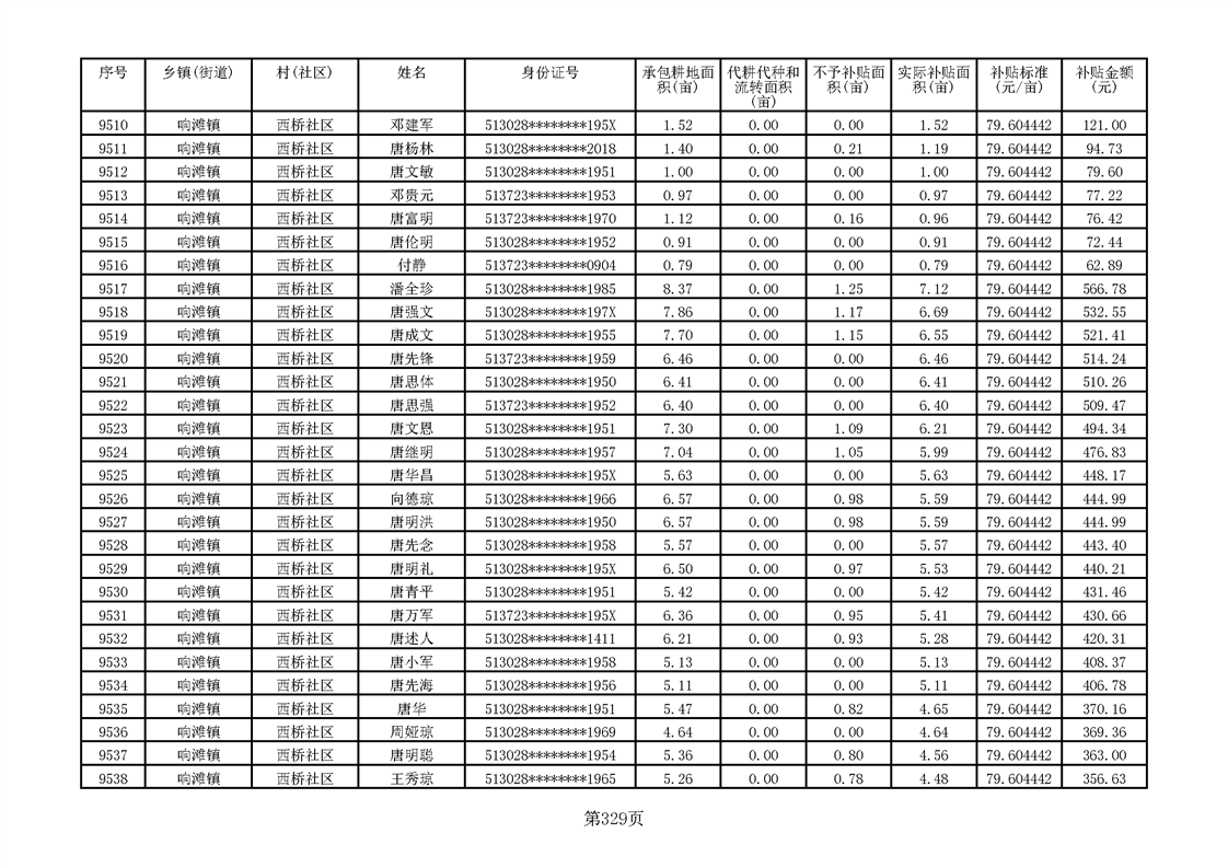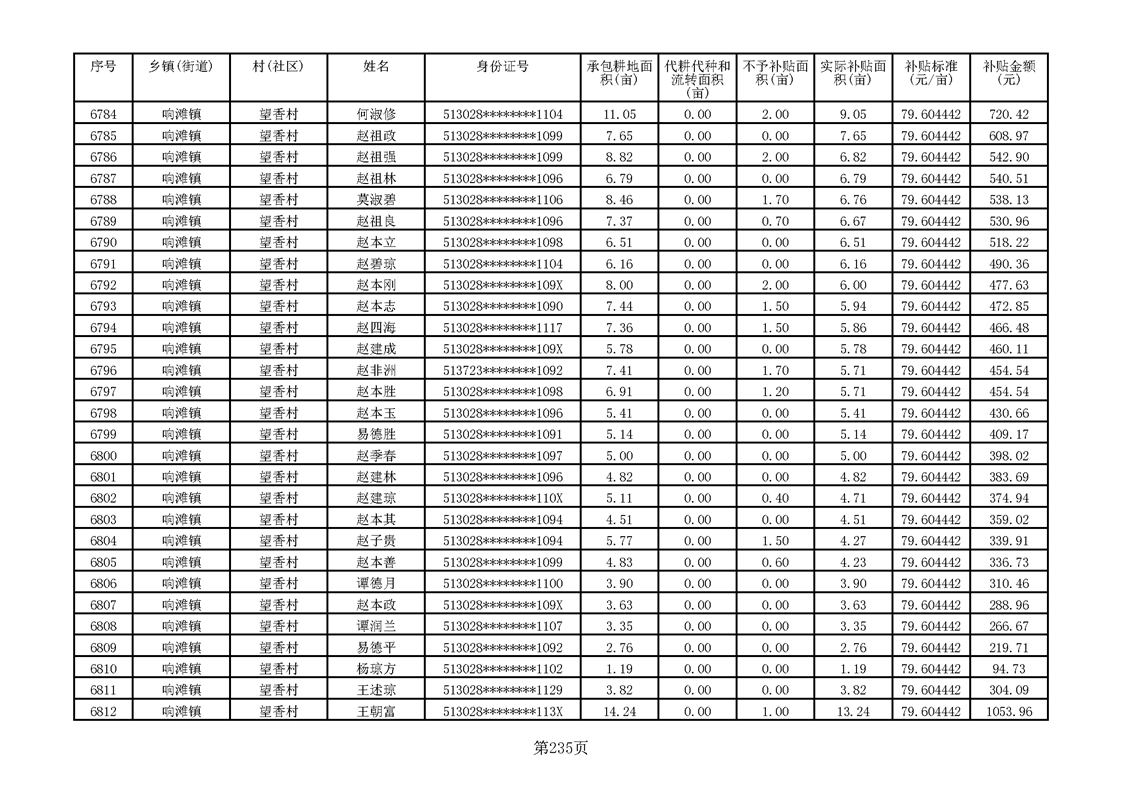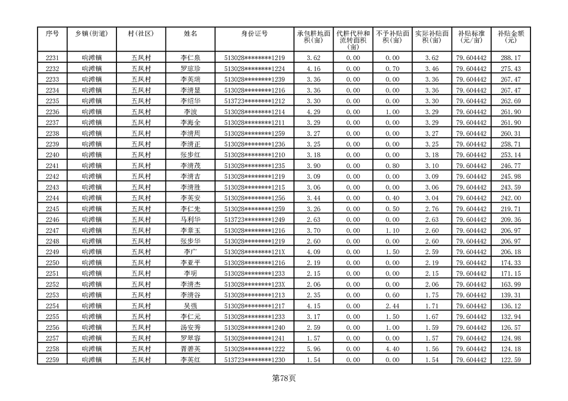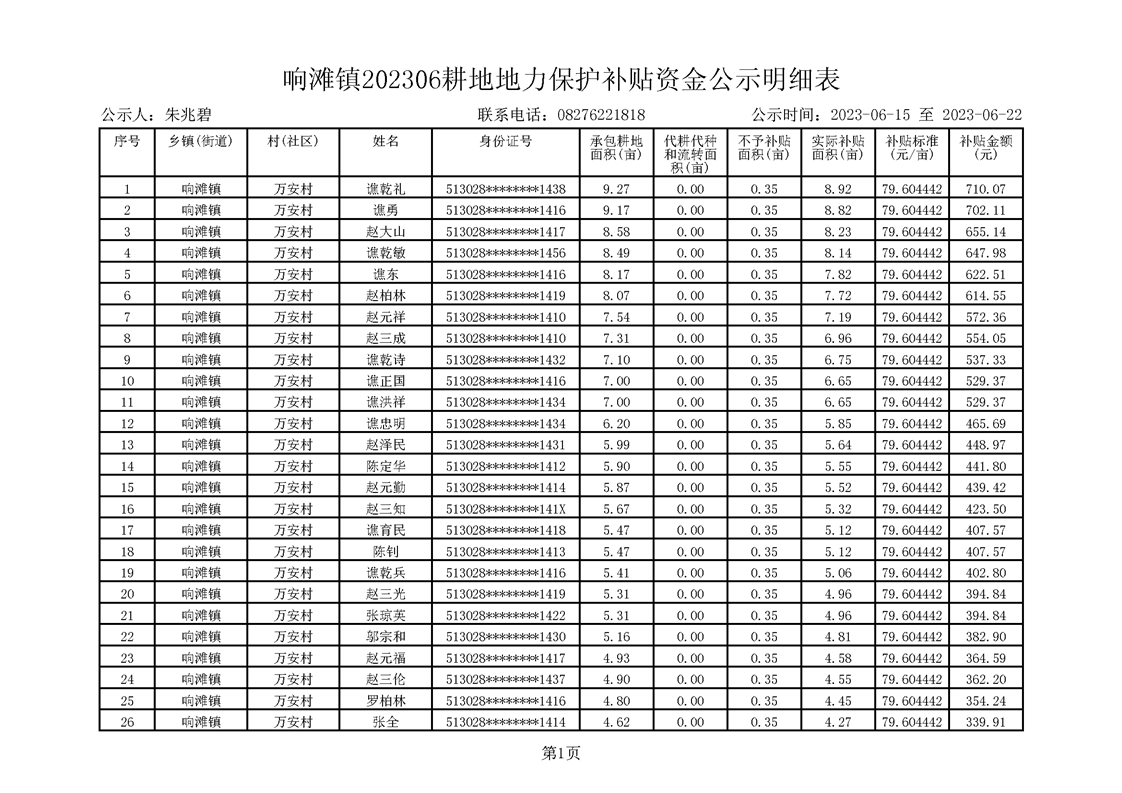 响滩镇2023年耕地地力保护补贴资金公示明细表