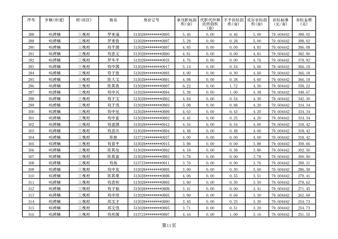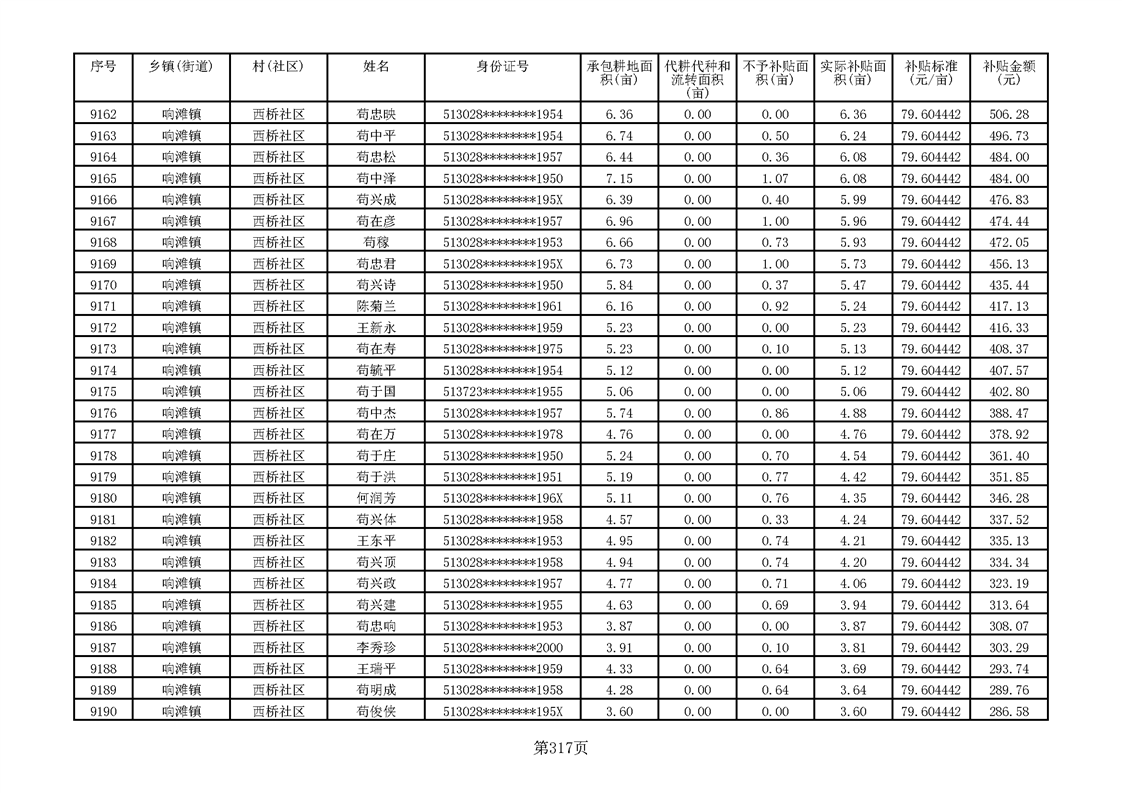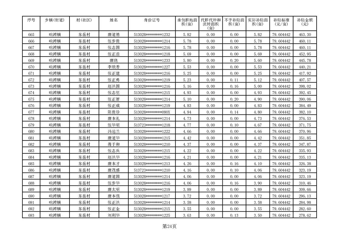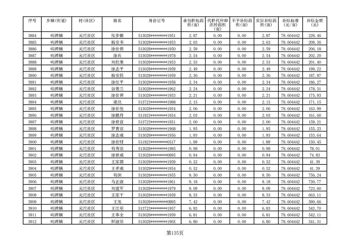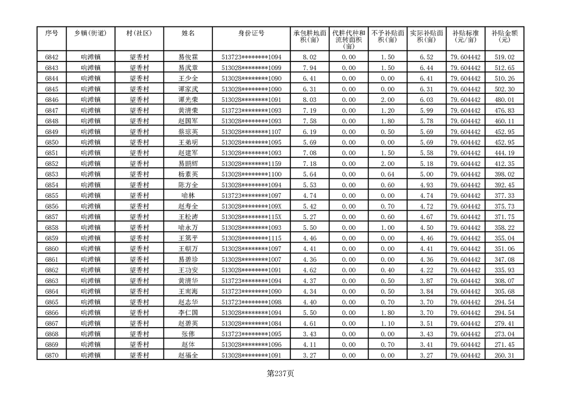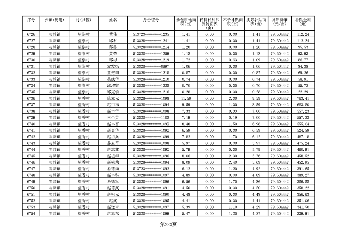 响滩镇2023年耕地地力保护补贴资金公示明细表