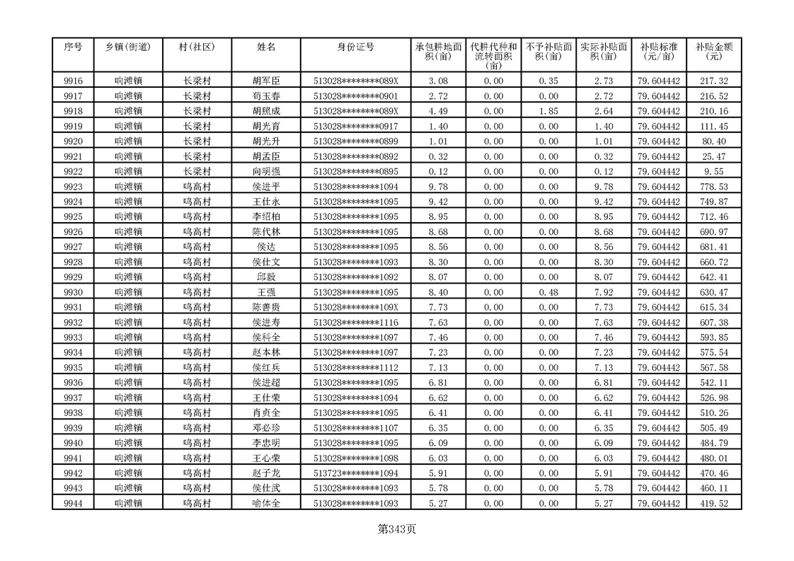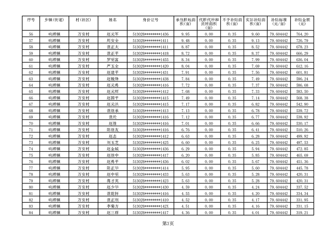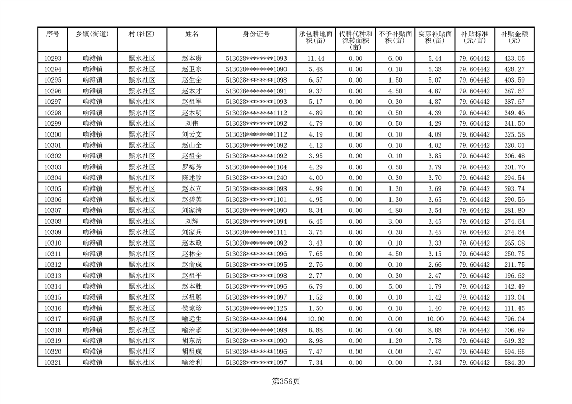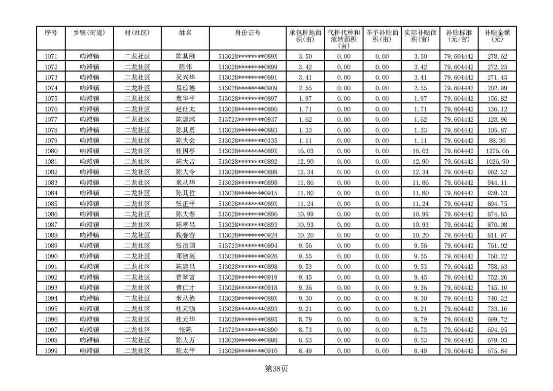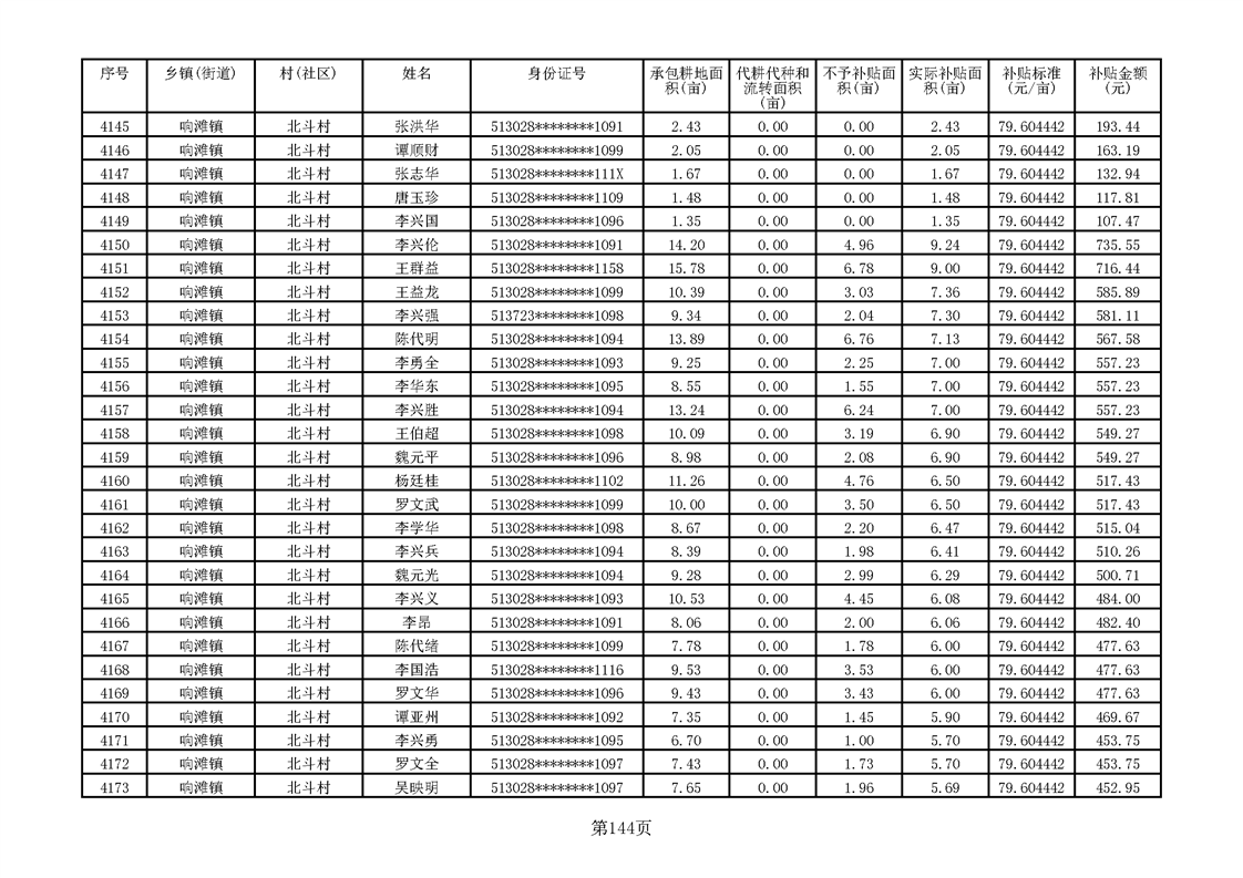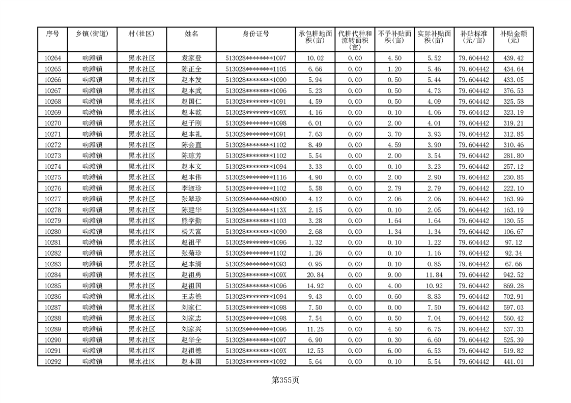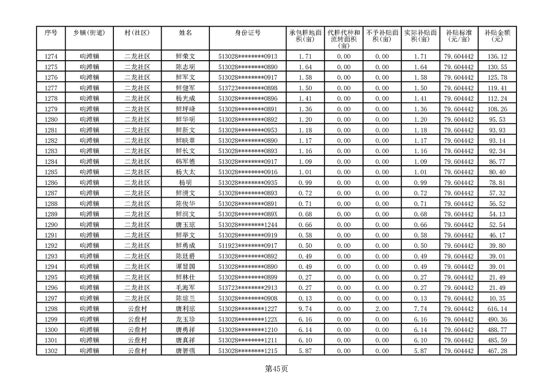响滩镇2023年耕地地力保护补贴资金公示明细表