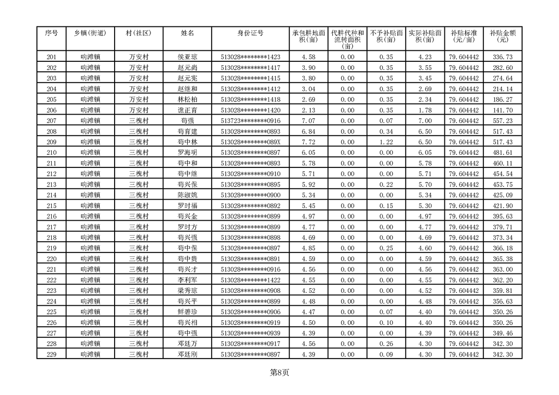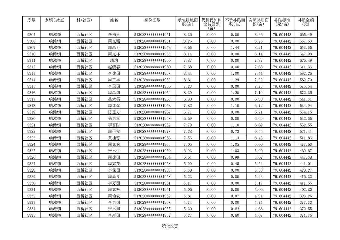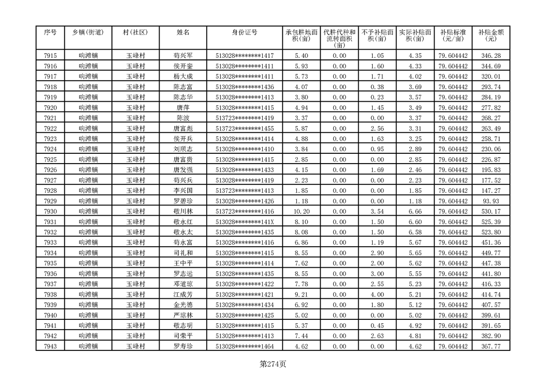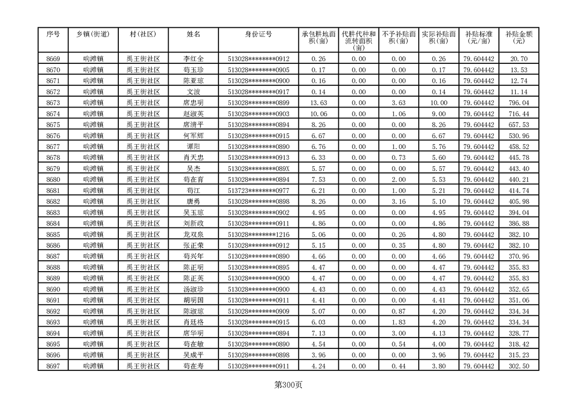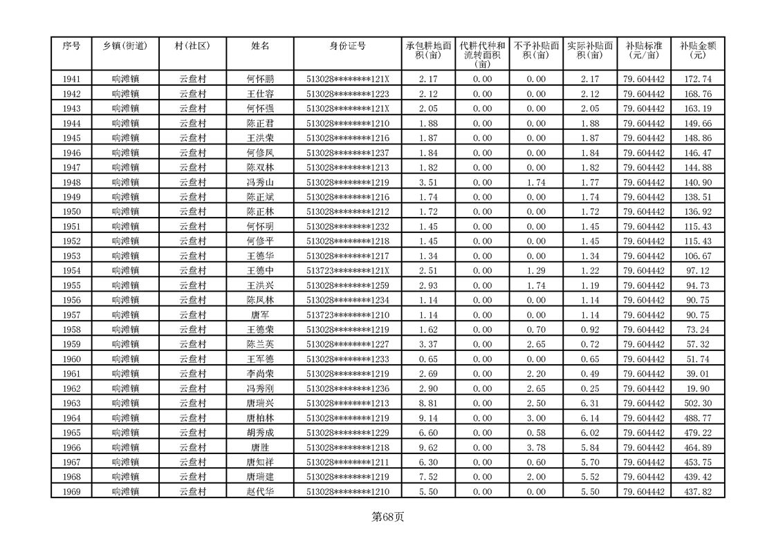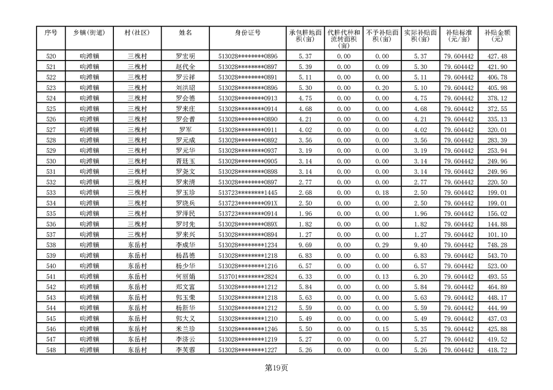 响滩镇2023年耕地地力保护补贴资金公示明细表